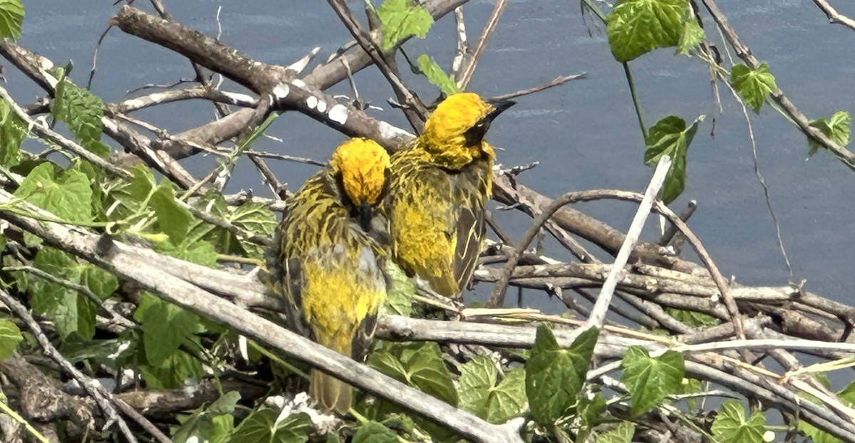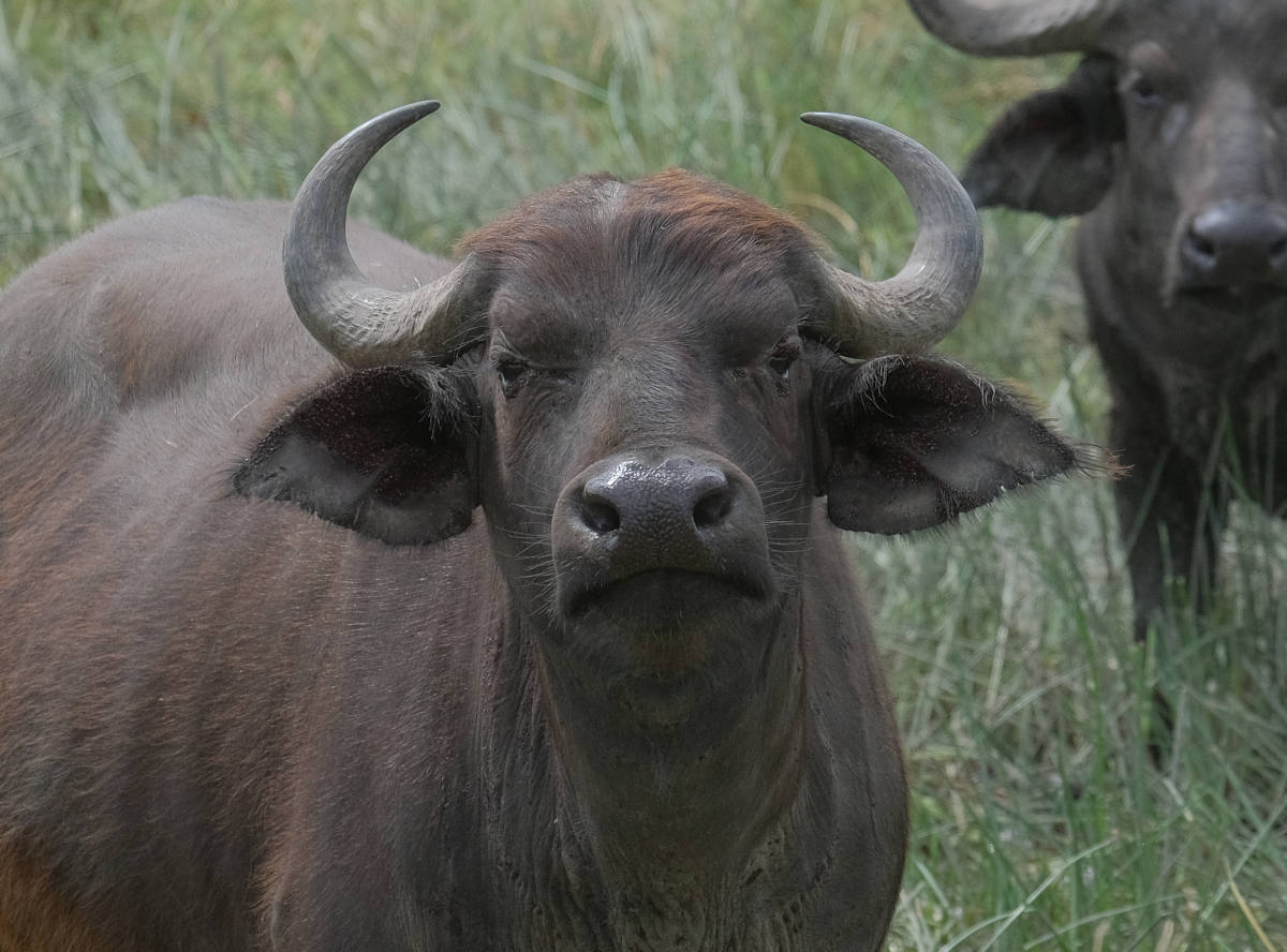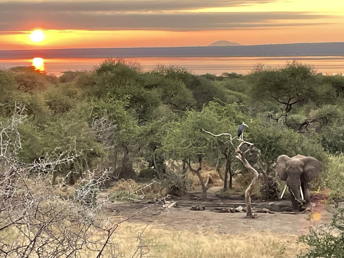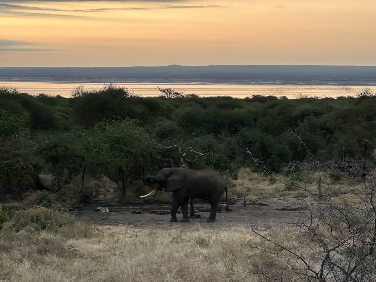 About 10 minutes before sunrise, our last morning at Burungi Lodge, looking toward the lake from the dining veranda, we see the same elephant that strolled past our room! 6:37