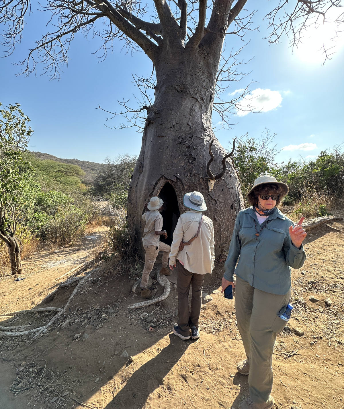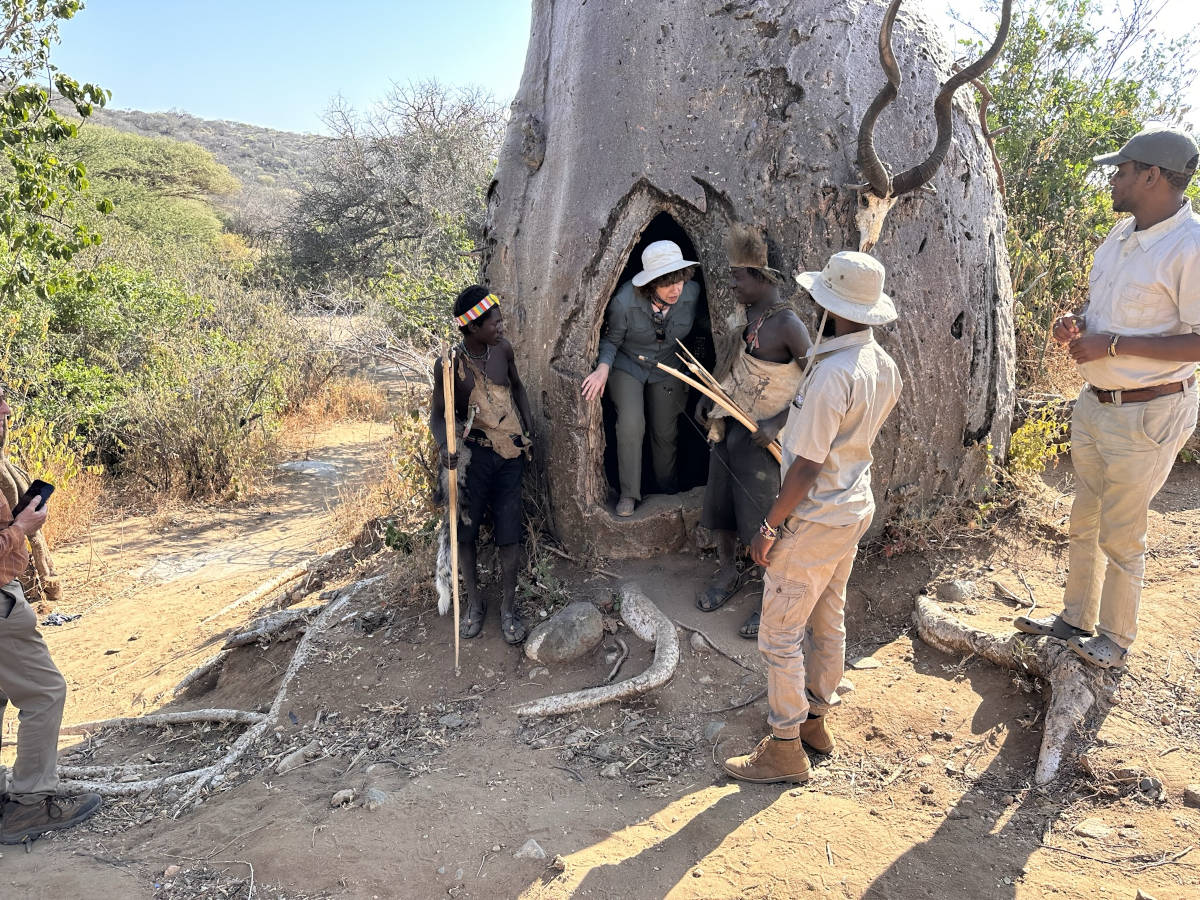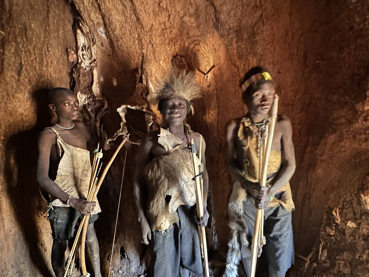 We start our visit with the Hadzabe. They use a click language. We will learn how and why the tribe utilizes this tree hollow.