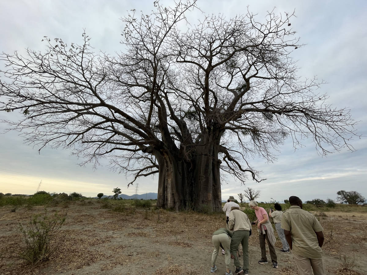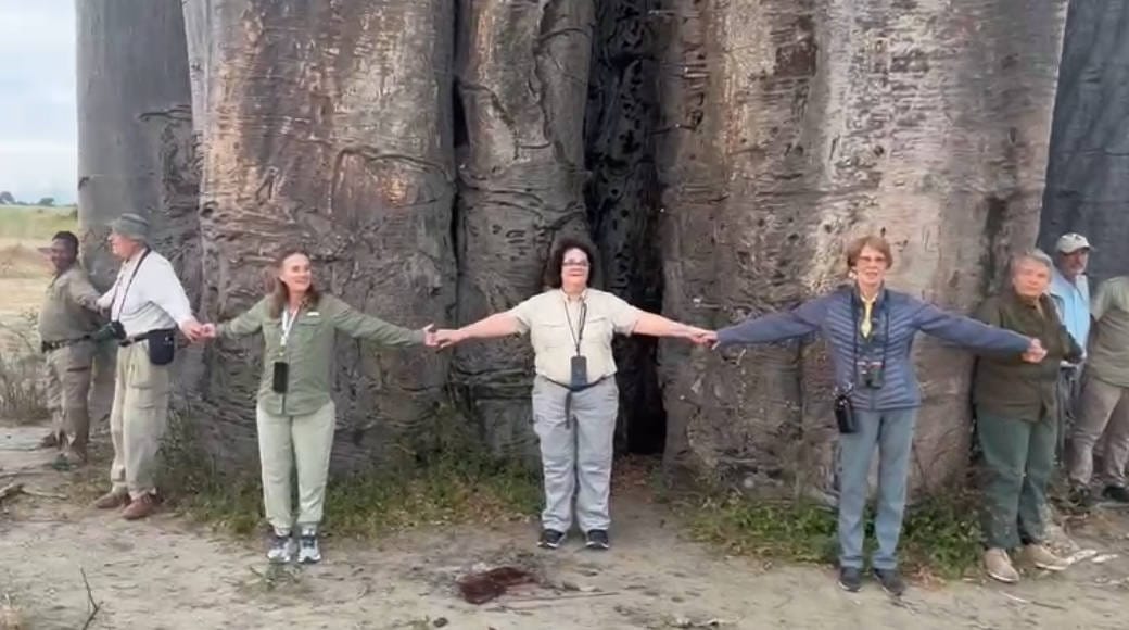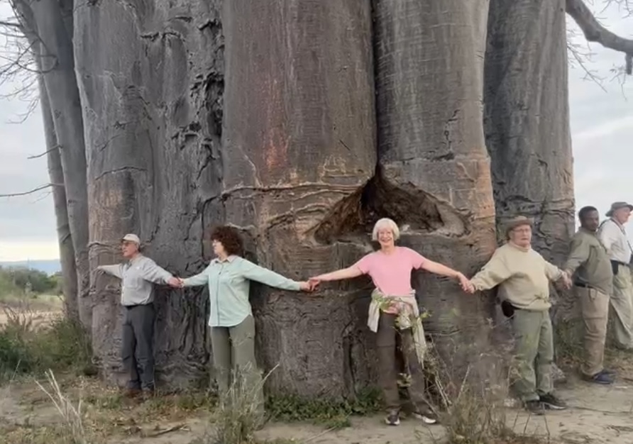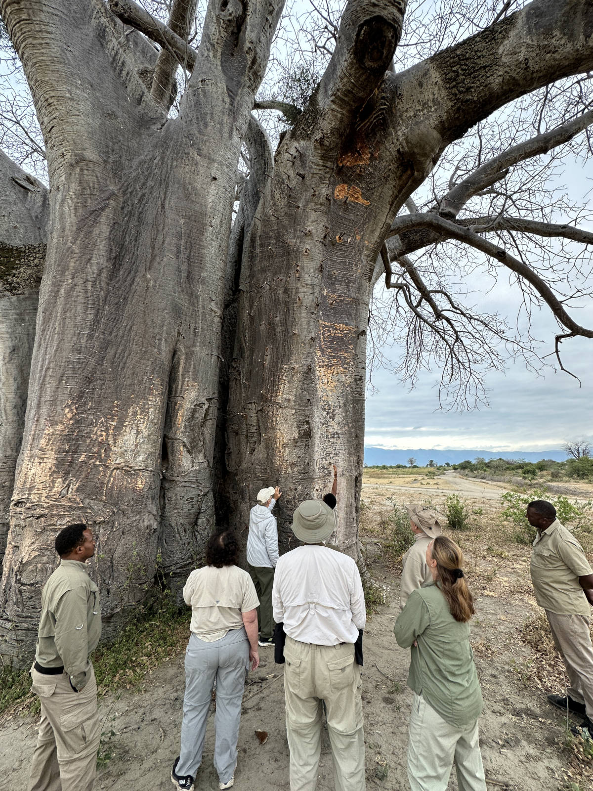 Group inspecting baobab tree. 7:29