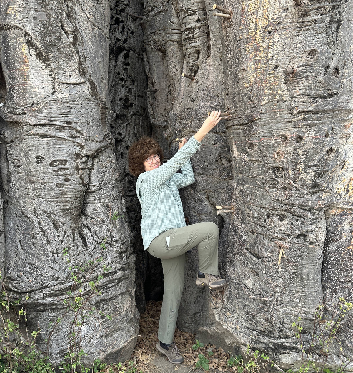 Linda "climbs" the pegs used by the honey hunters. They always put in new pegs as the tree slowly expels the older pegs.
