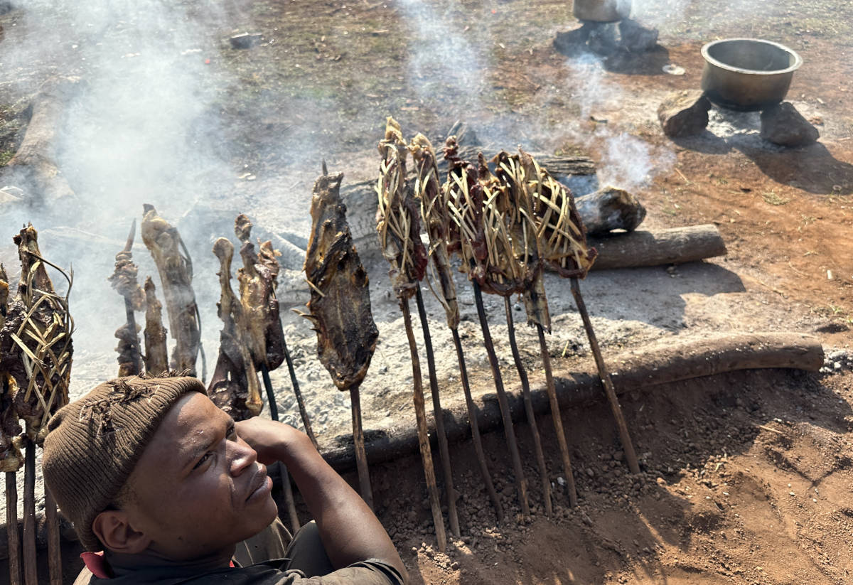 Cooking meat over an open fire.