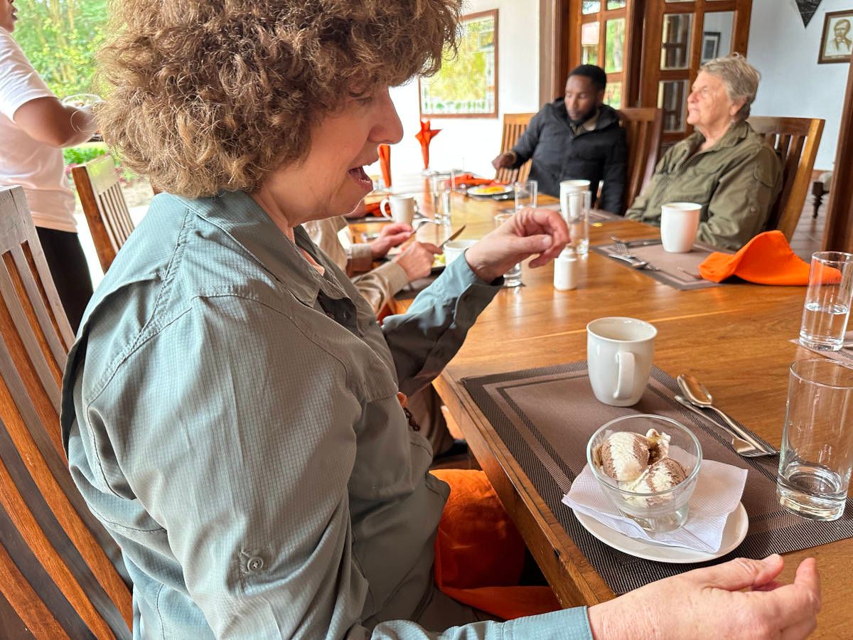 Back at our lodge for lunch, we enjoy dessert. 2:43
