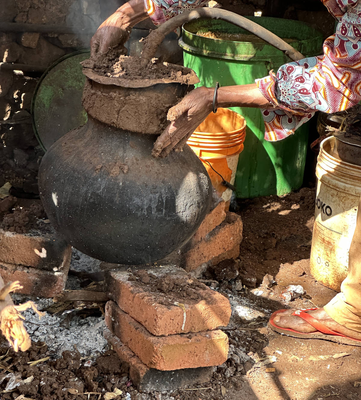 The Datoga do a lot of metal working. Here they are melting some brass. They use bellows made of goat skins to fan the fire.