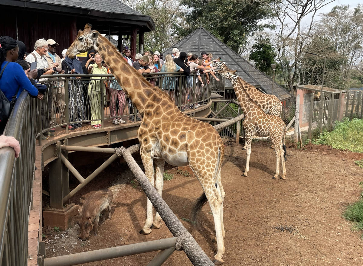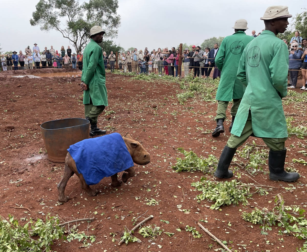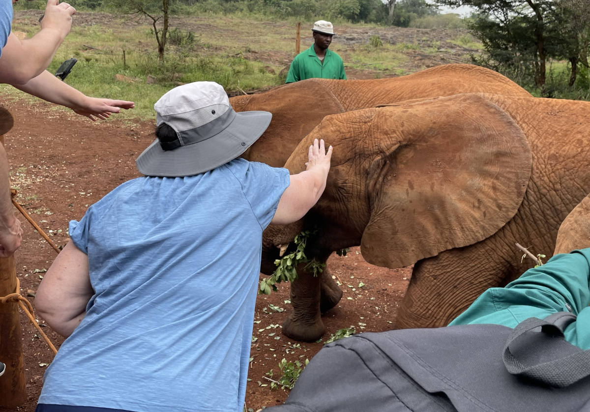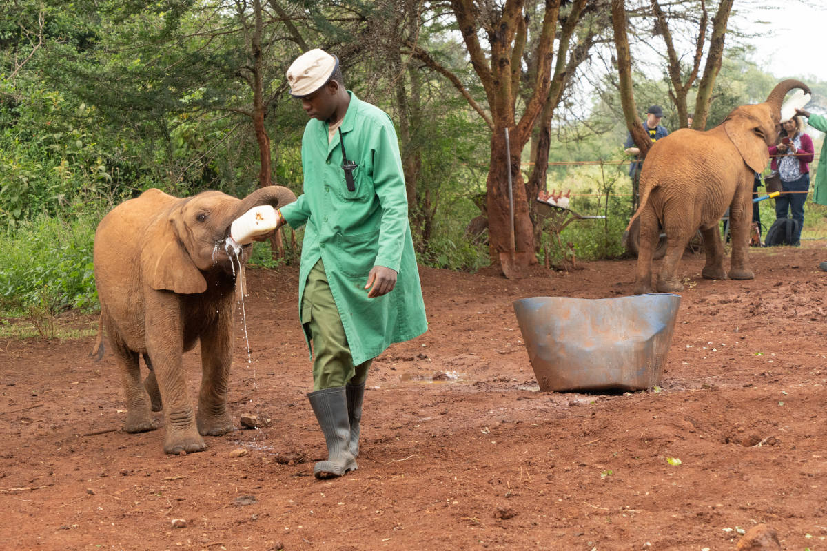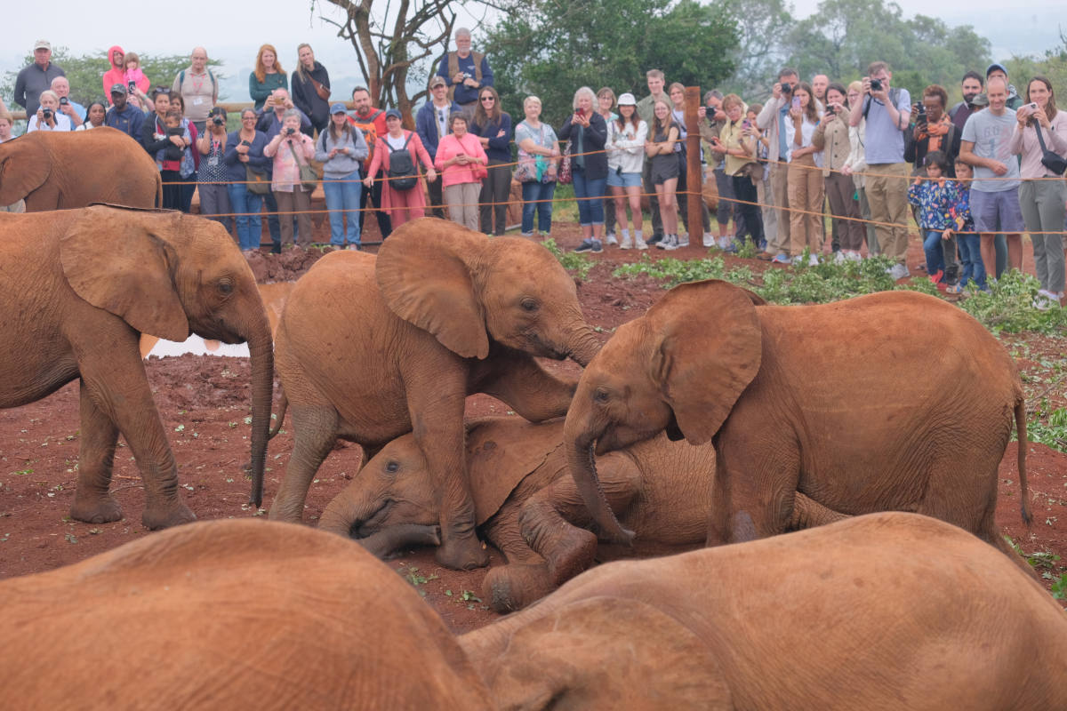 Our very first outing with the full group of 10 travelers was to the Daphne Sheldrick Elephant Orphanage. However, the first animal they brought out was a baby rhinoceros! Its tail had been eaten off by a hyena, so the orphanage adopted him even though they typically rescue elephants. 11am