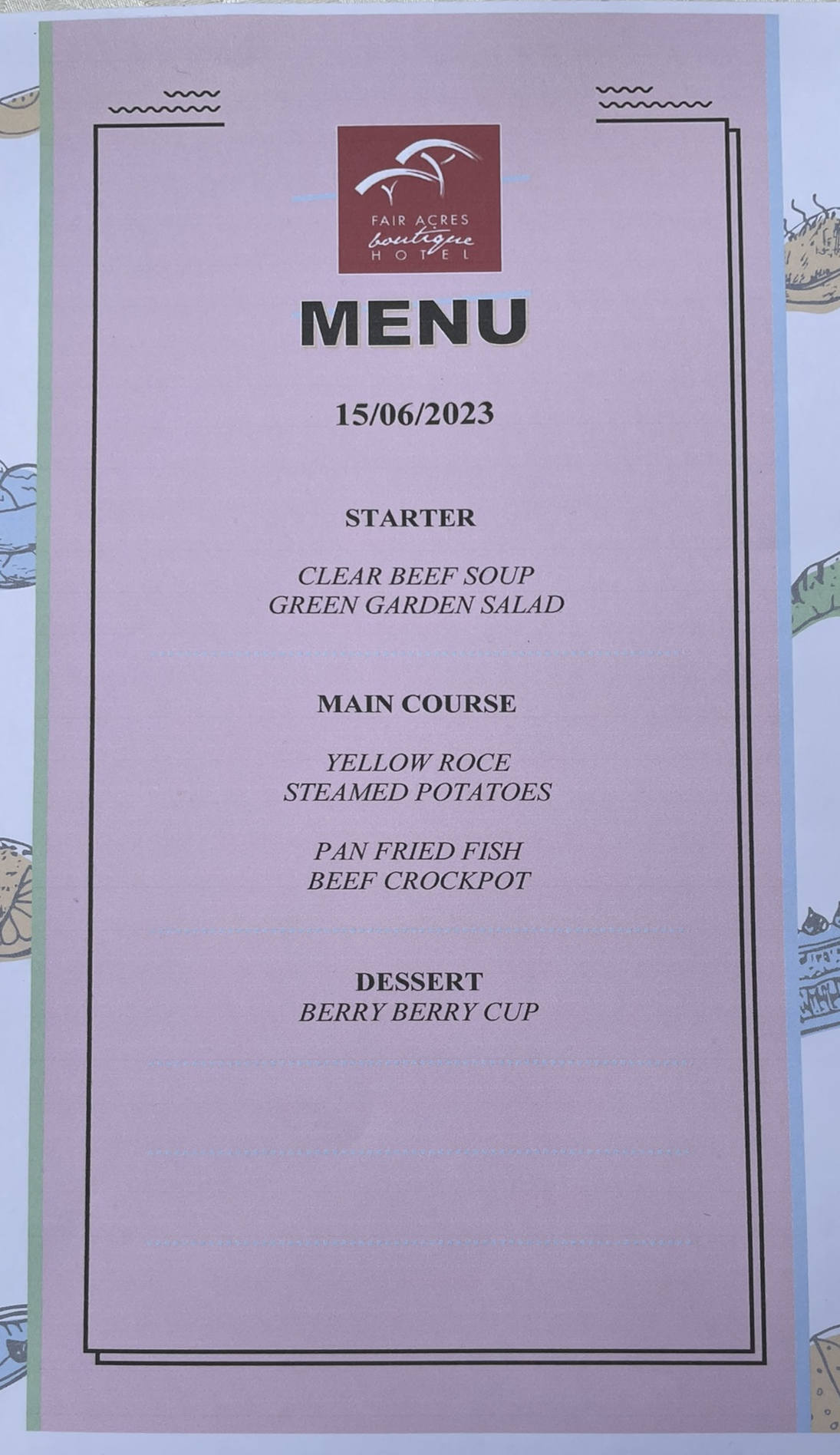 Here's what's for lunch at Fair Acres Boutique Hotel restaurant. 1PM