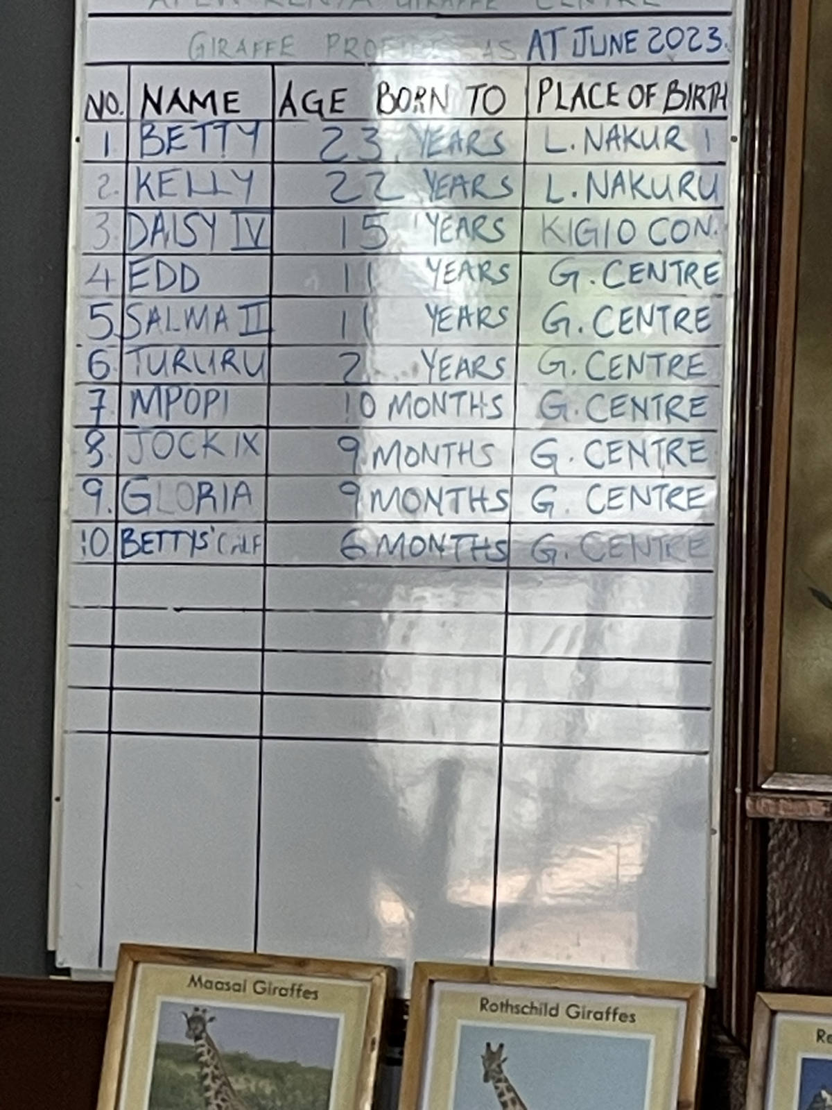 We visit the Giraffe Center. Here's a name chart of the animals currently at this center. 2:30