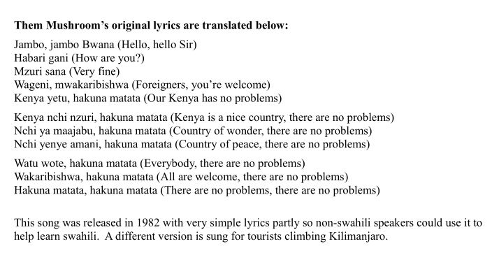 Lyrics to the song Jambo Bwana released in 1982. Written and sung by "Them Mushrooms", a Kenyan group.