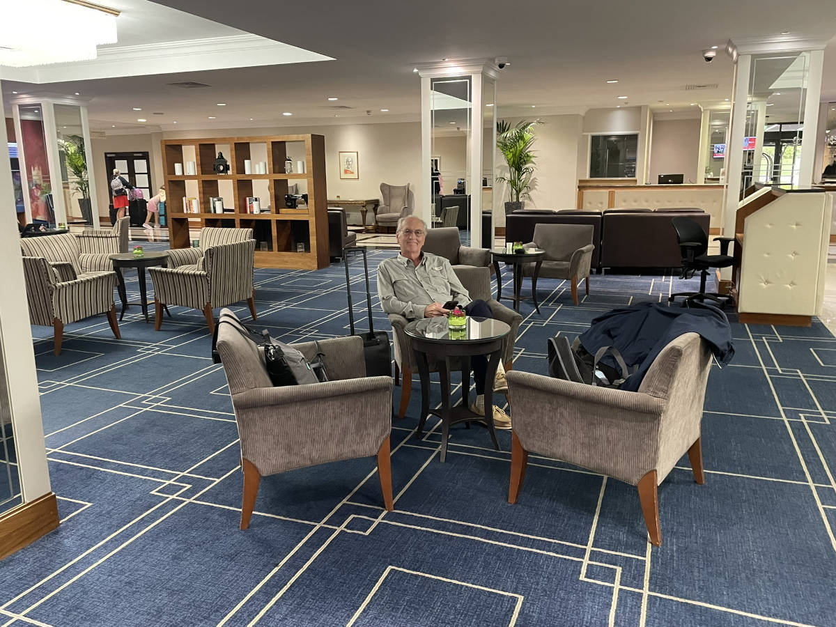 In the lobby of the Renaissance Hotel. 12:06.