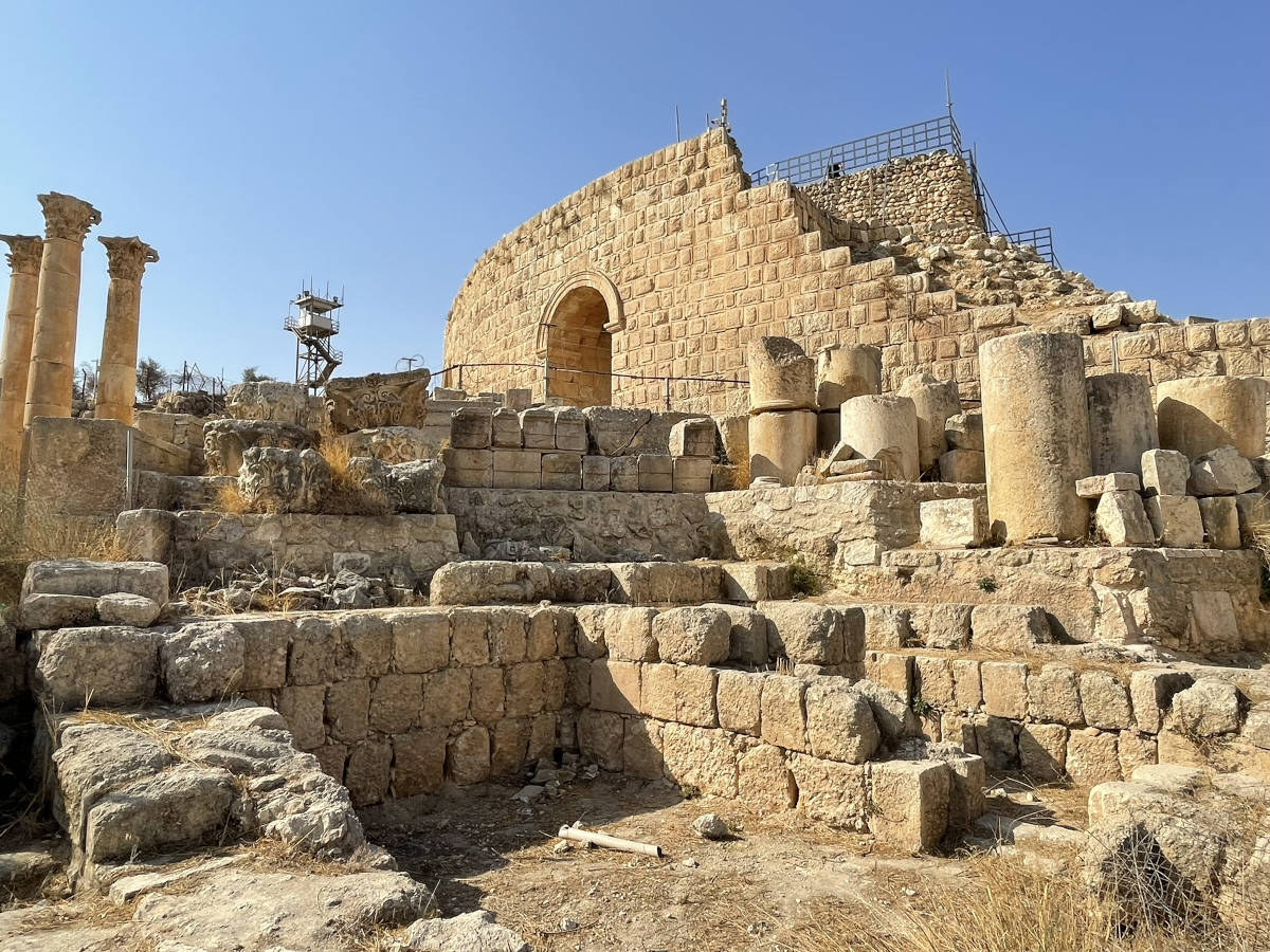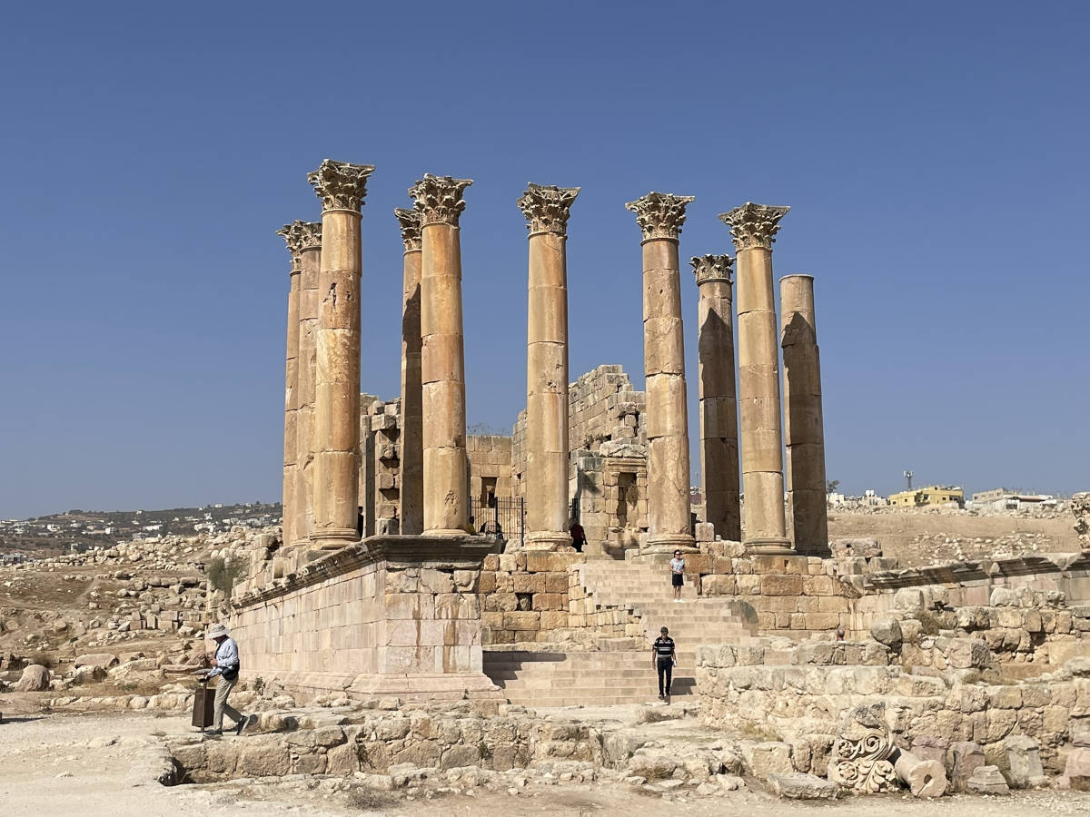 We drive to this treasure north of Amman. The ancient city of Jerash. Here we approach through Hadrian's gate. 10:01