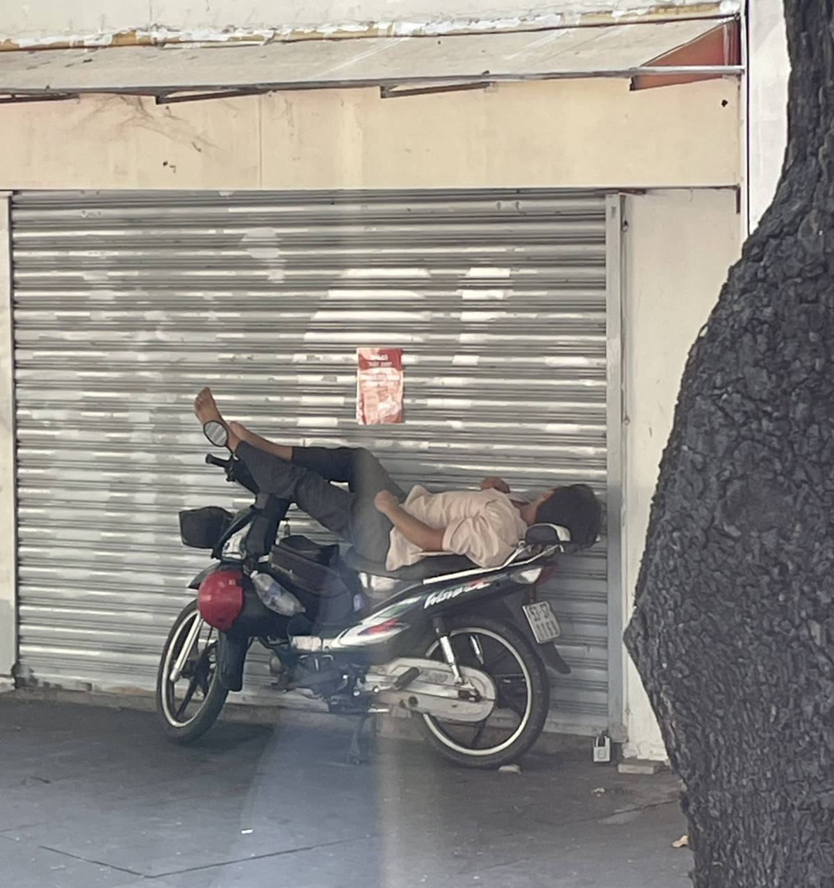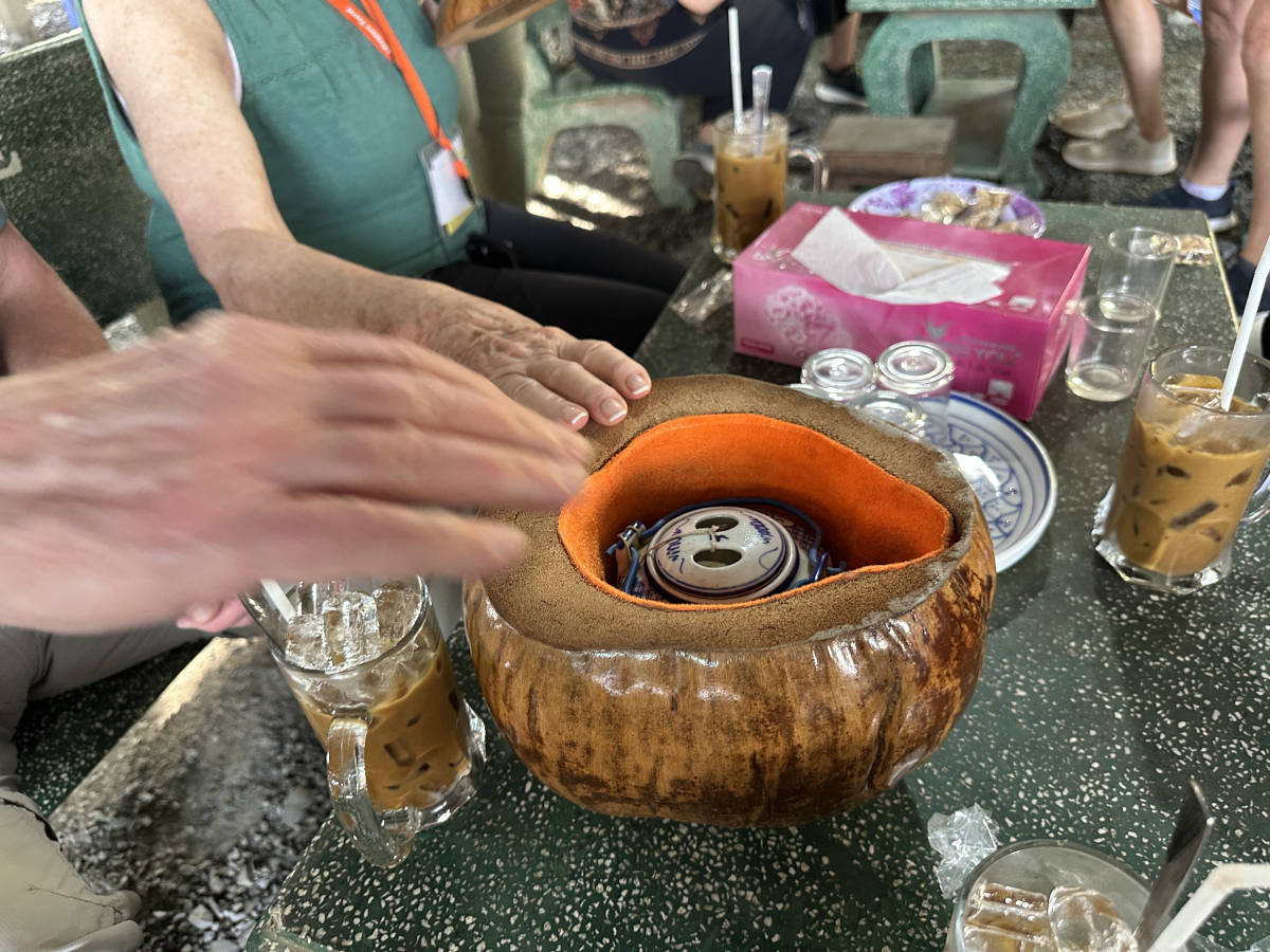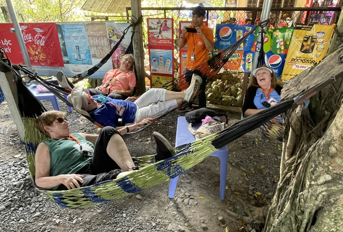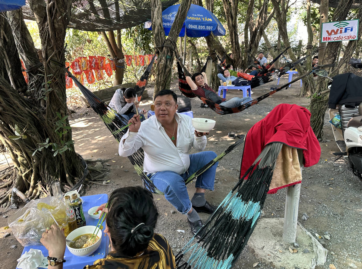 We stop for coffee. There are many places in South Vietnam like this one, where hammocks are provided for the patrons to enjoy their beverage. Emerson occupied a hammock close to this guy and his wife for awhile - they were a lot of fun! 9:49am