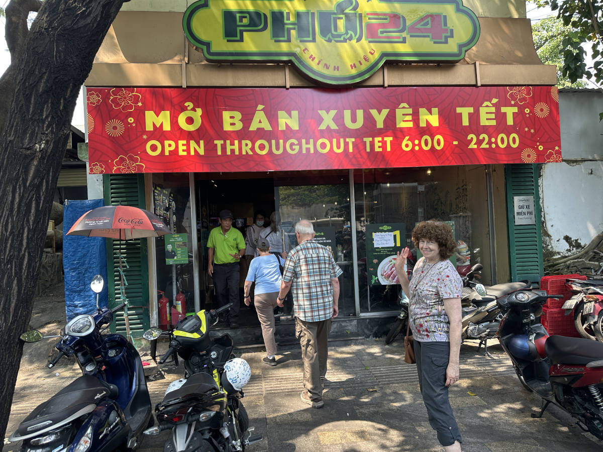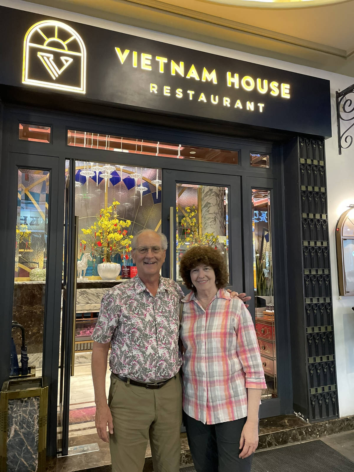 Emerson and Linda pose outside the restaurant to send our photo to Tri!