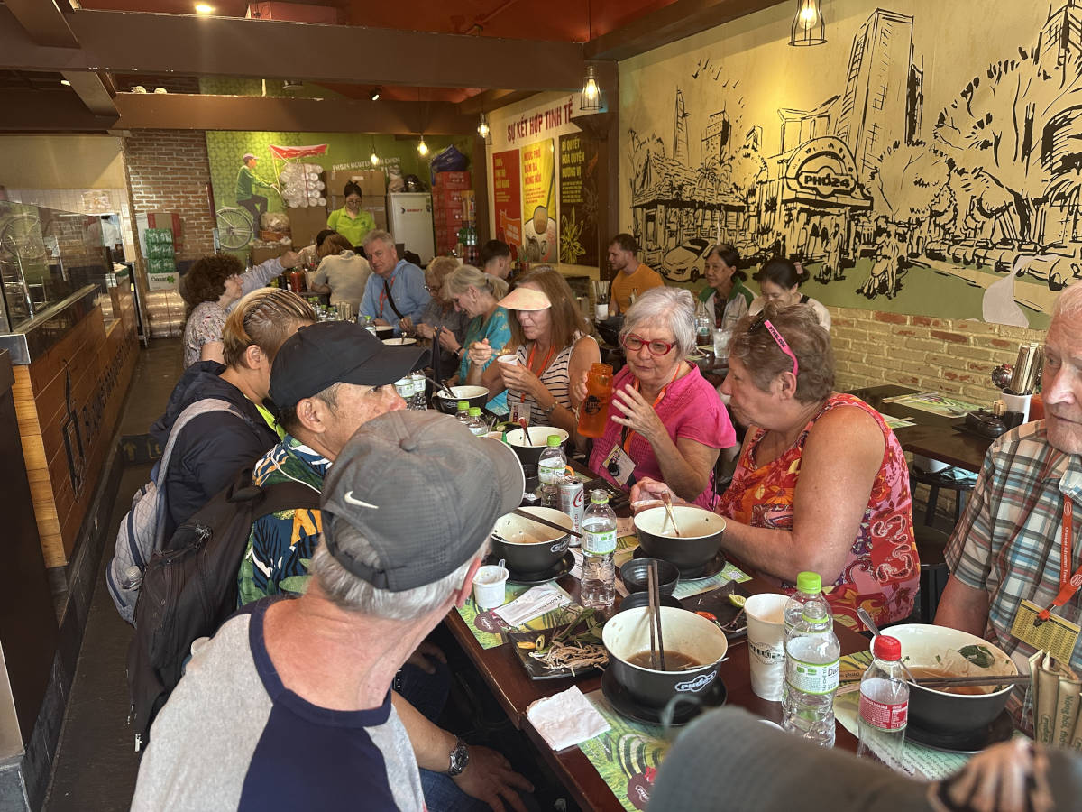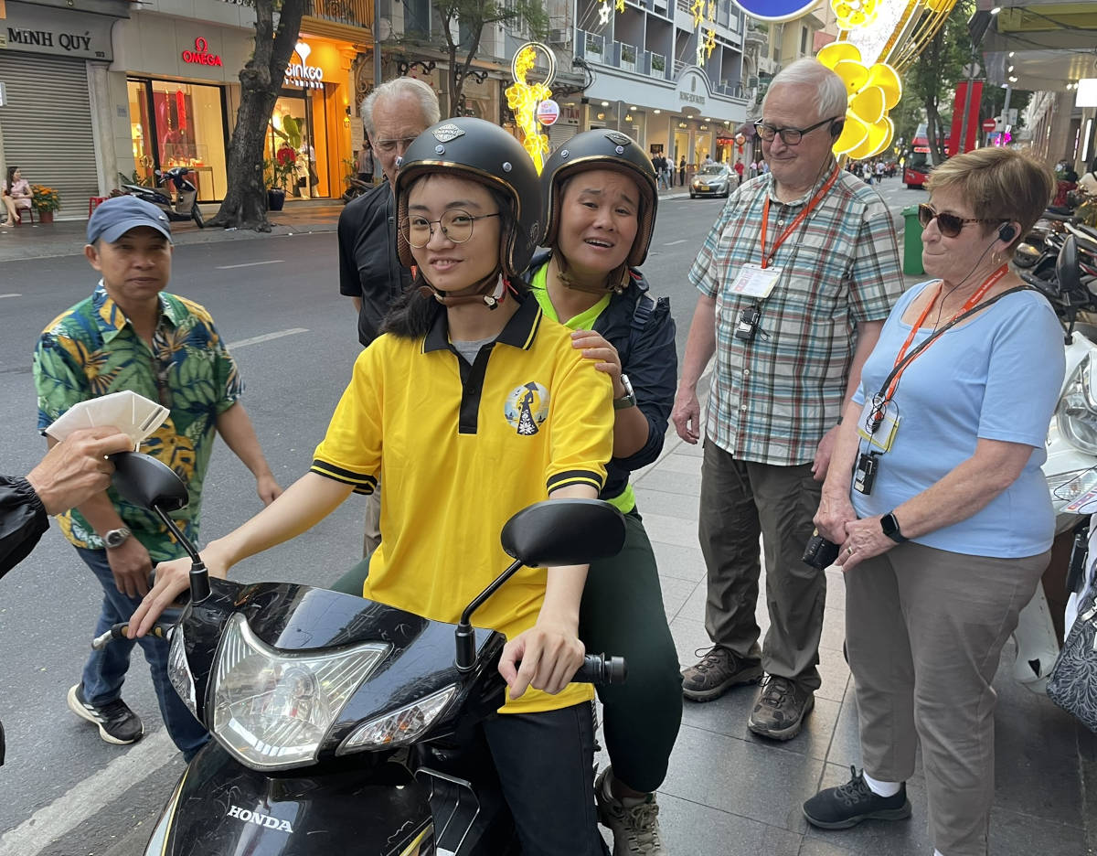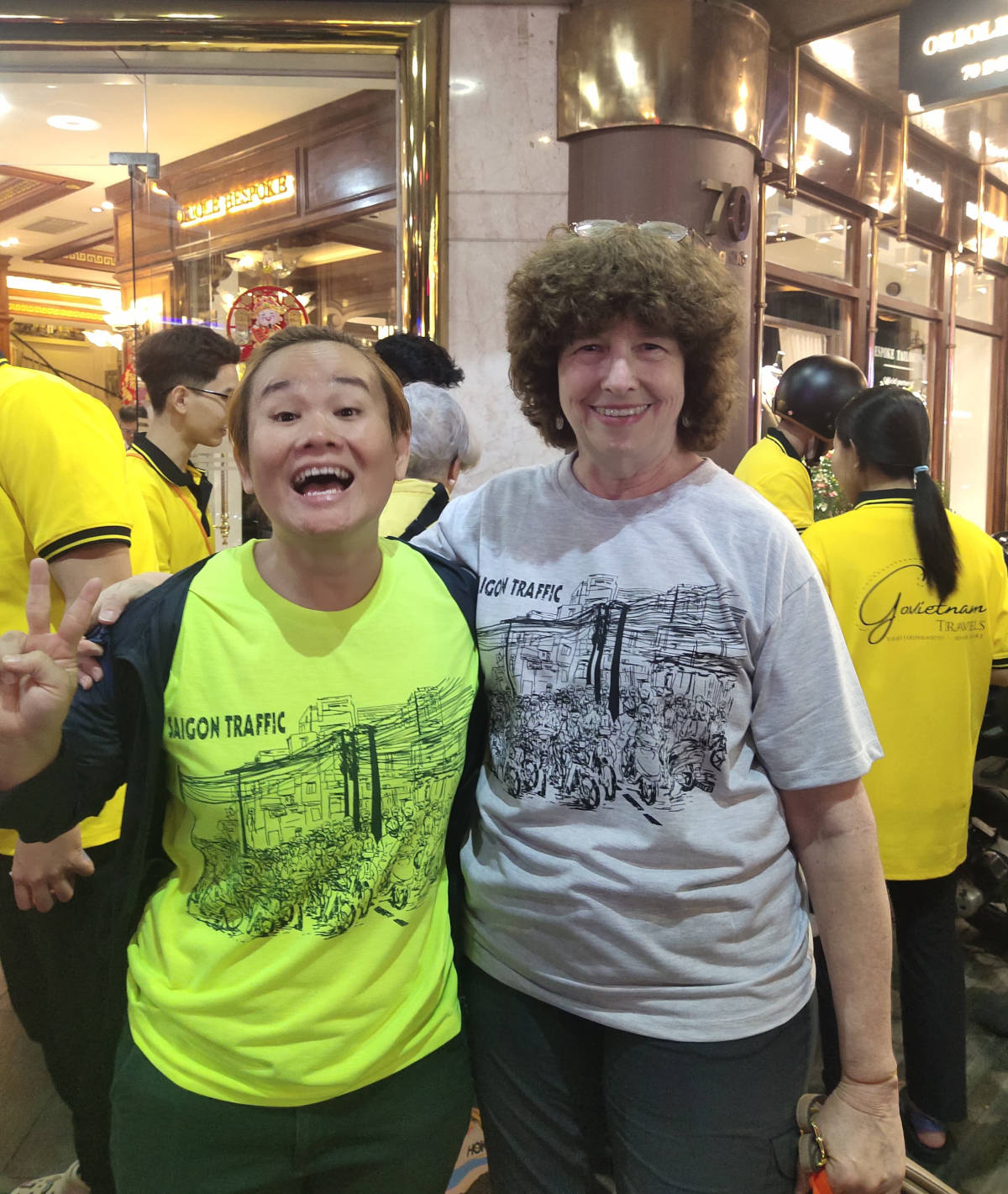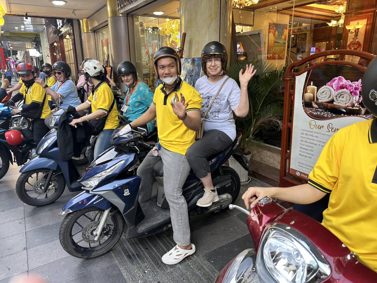 We sign up for an optional scooter tour. Shirley and Linda have on Saigon Traffic tee shirts.