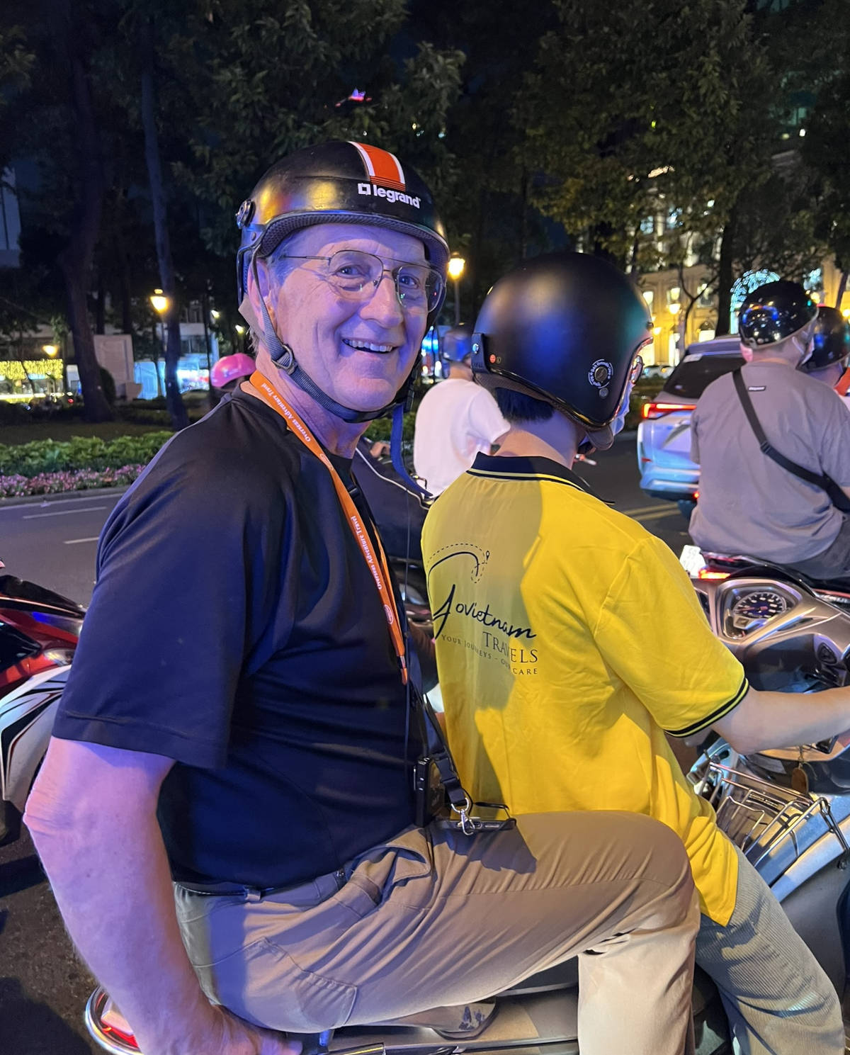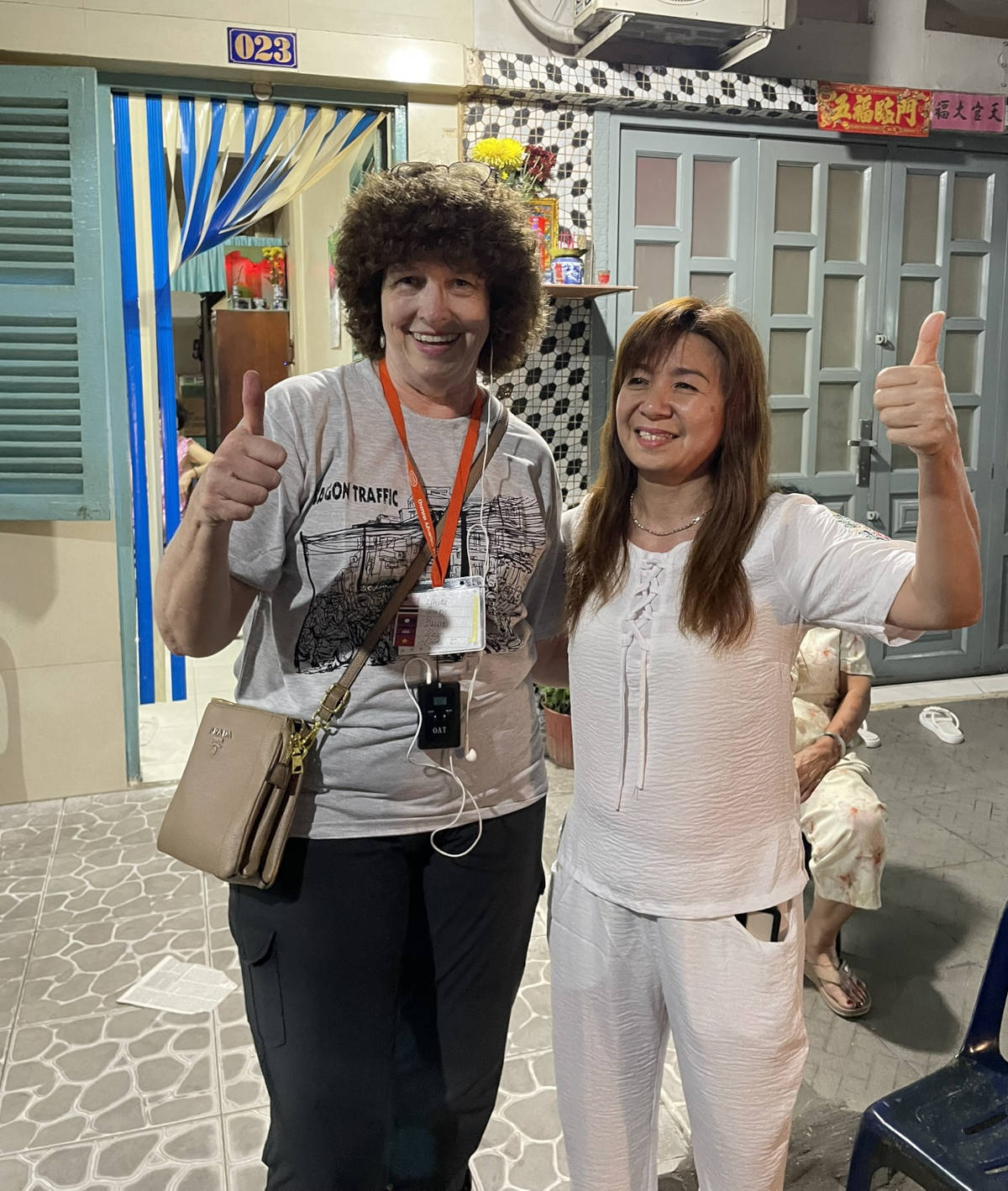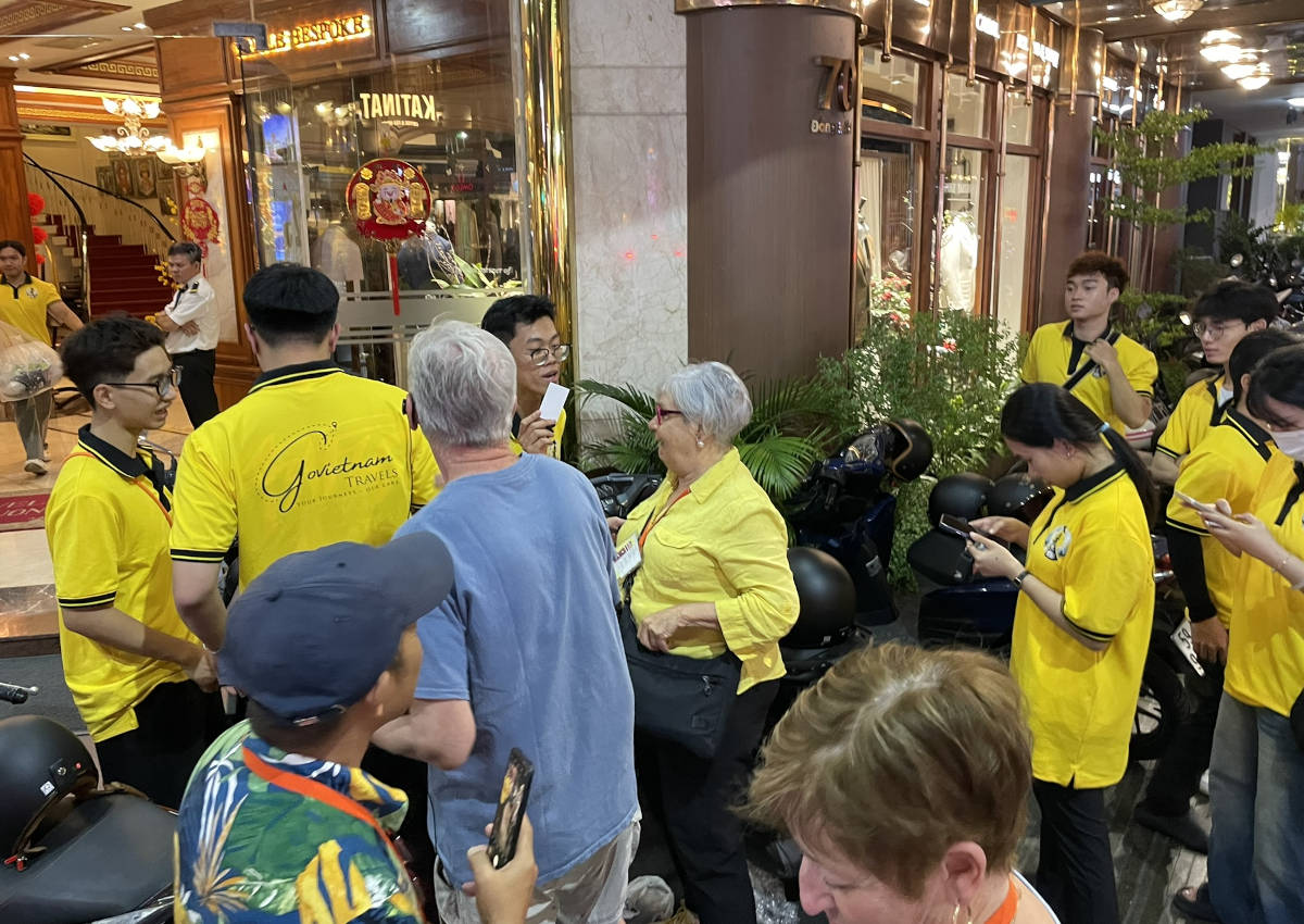 We sign up for an optional scooter tour. Shirley and Linda have on Saigon Traffic tee shirts.