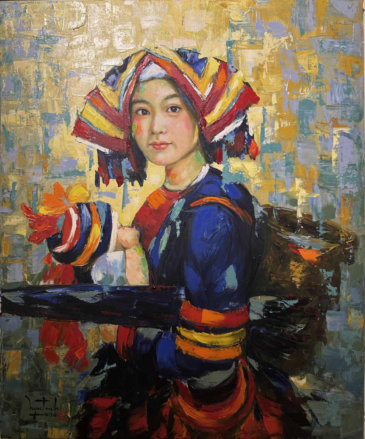 Before we leave our hotel, we tour the first few floors and stairway of the hotel that are filled with paintings for sale. We particularly liked this one. In North Vietnam we would realize that this is a Hmoung woman and child. 8:23