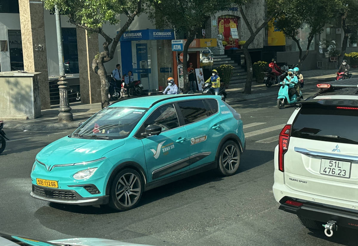 The Aqua colored Vinfast cars and scooters are electric taxi's owned by the richest man in Vietnam. There were a lot of them operating.