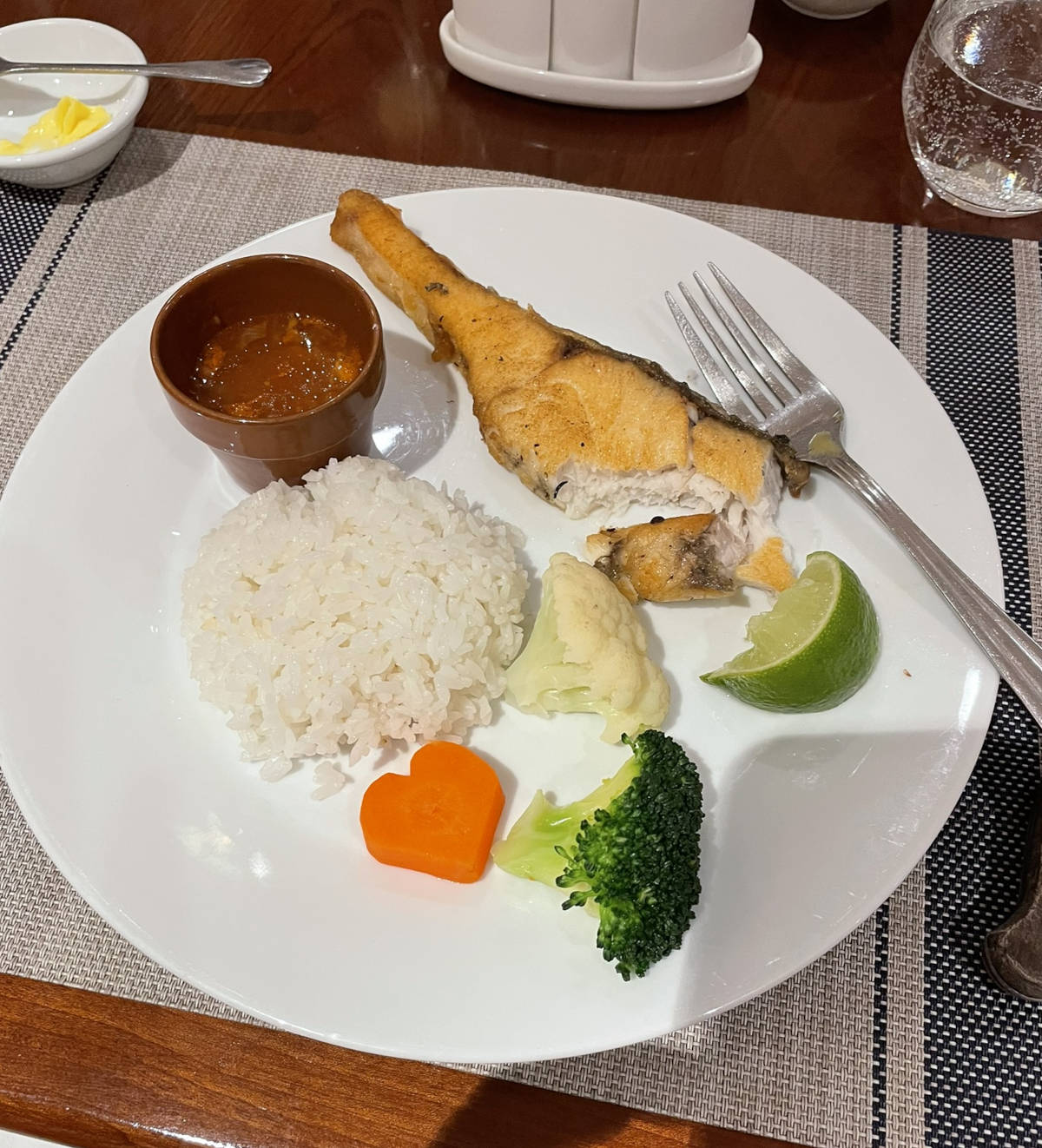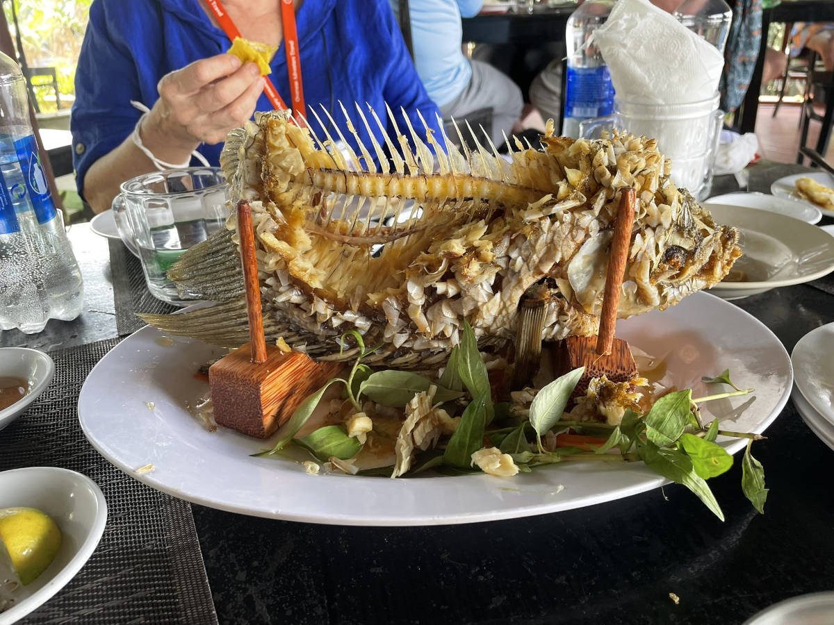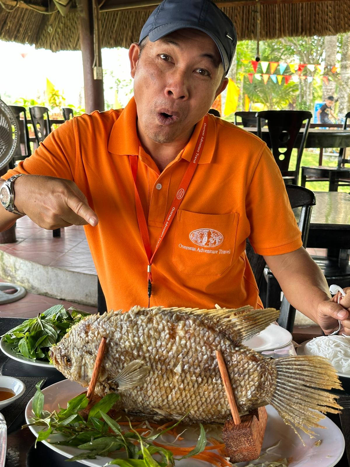 Nop poses with the lovely presentation of tilapia fish we're having for lunch!