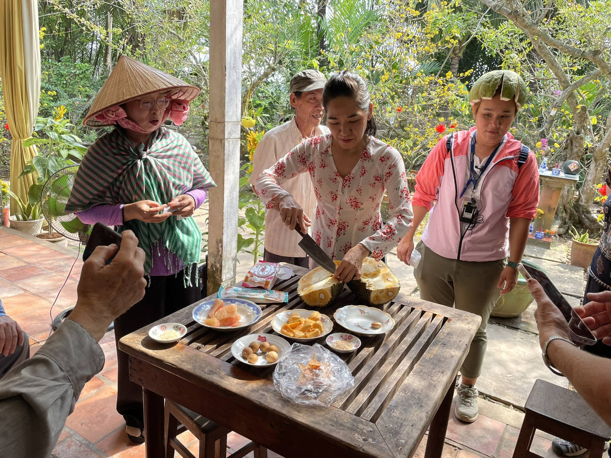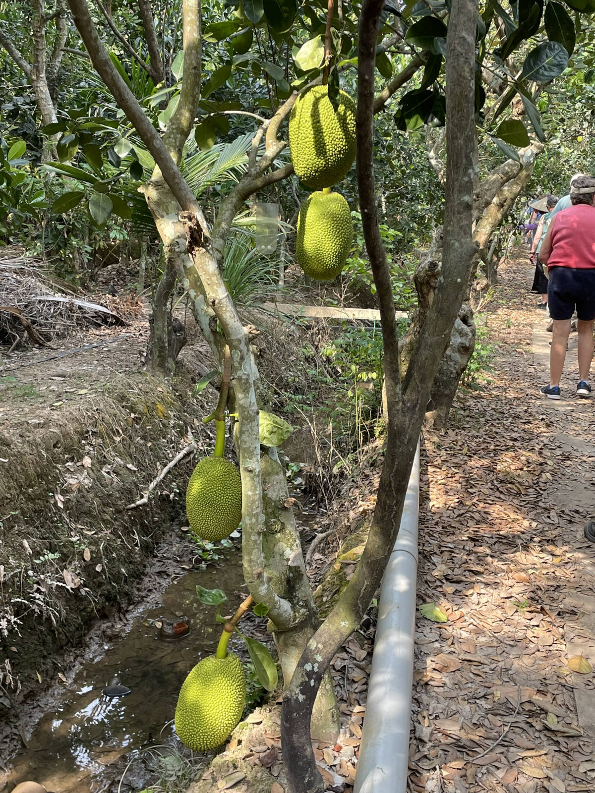 Fruit we sampled included longon, pomelo and jackfruit. Shirley has made a hat from some of the fruit.