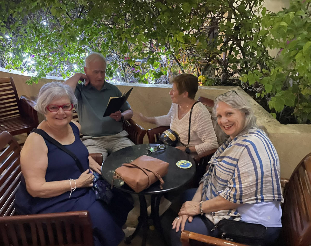 Linda W, Tom, Roni, LaDonna and Linda D (snapping the photo) have drinks at the Skybar at Hotel Caravelle. 9:16