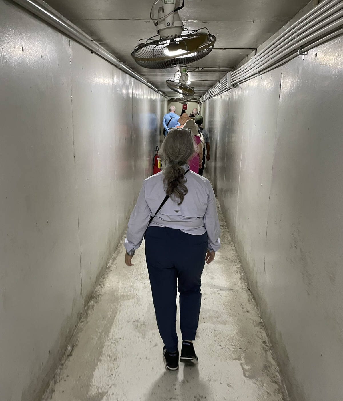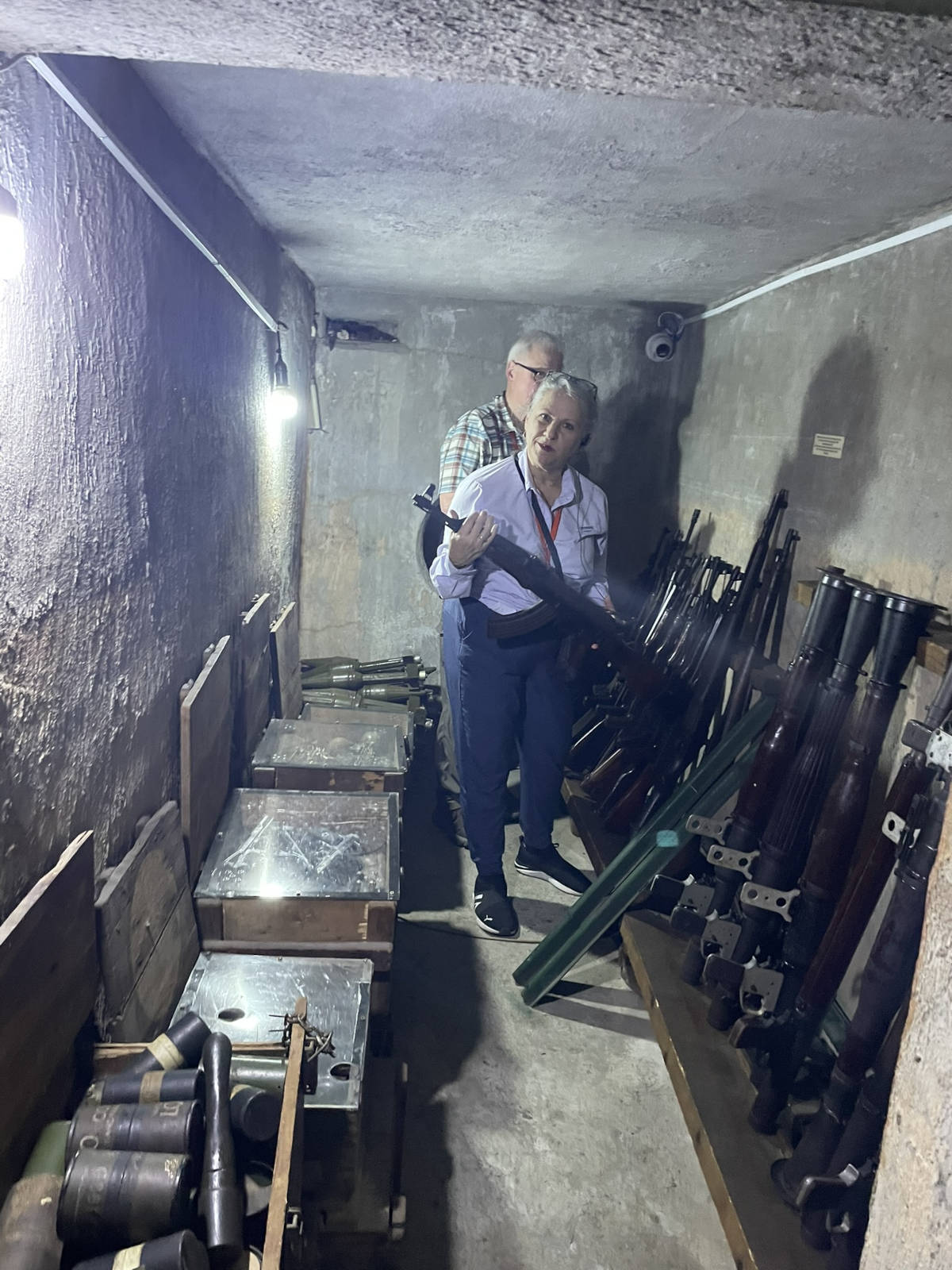We go inside the house and descend through a hidden entrance. Cut outs in the door behind Linda are for weapons that were smuggled inside the doors.