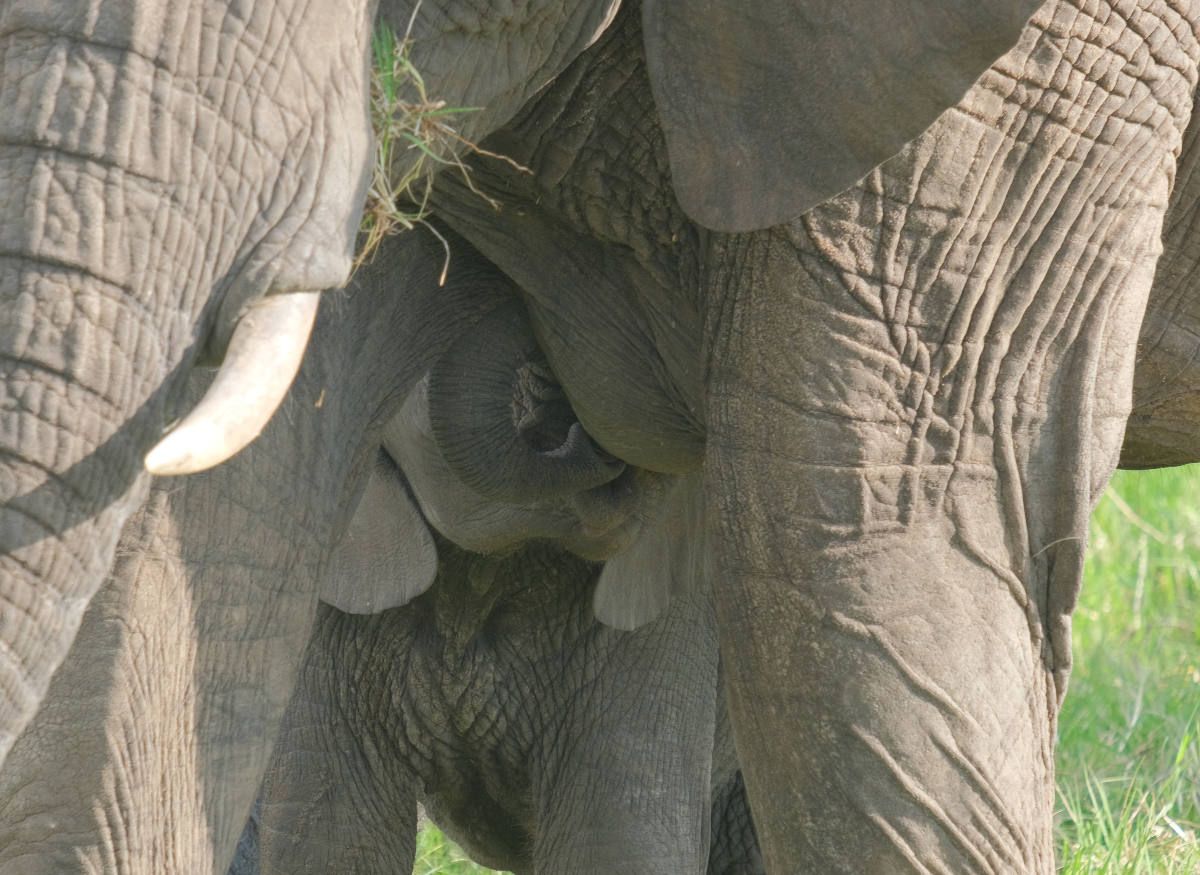 Allen estimates age of this baby ele. He starts by saying 6 months here but revises it down from that (after video cuts off). Because it appears this little ele can fit easily under the mama, Allen says it's more like 3 months of age. 4:29