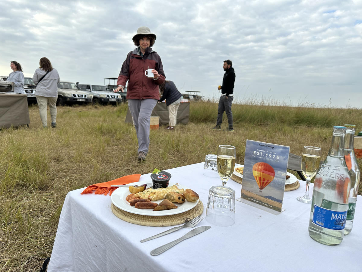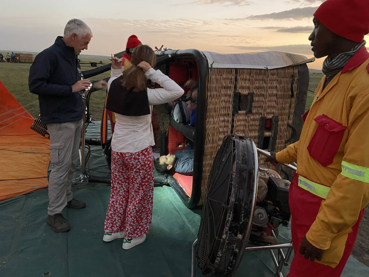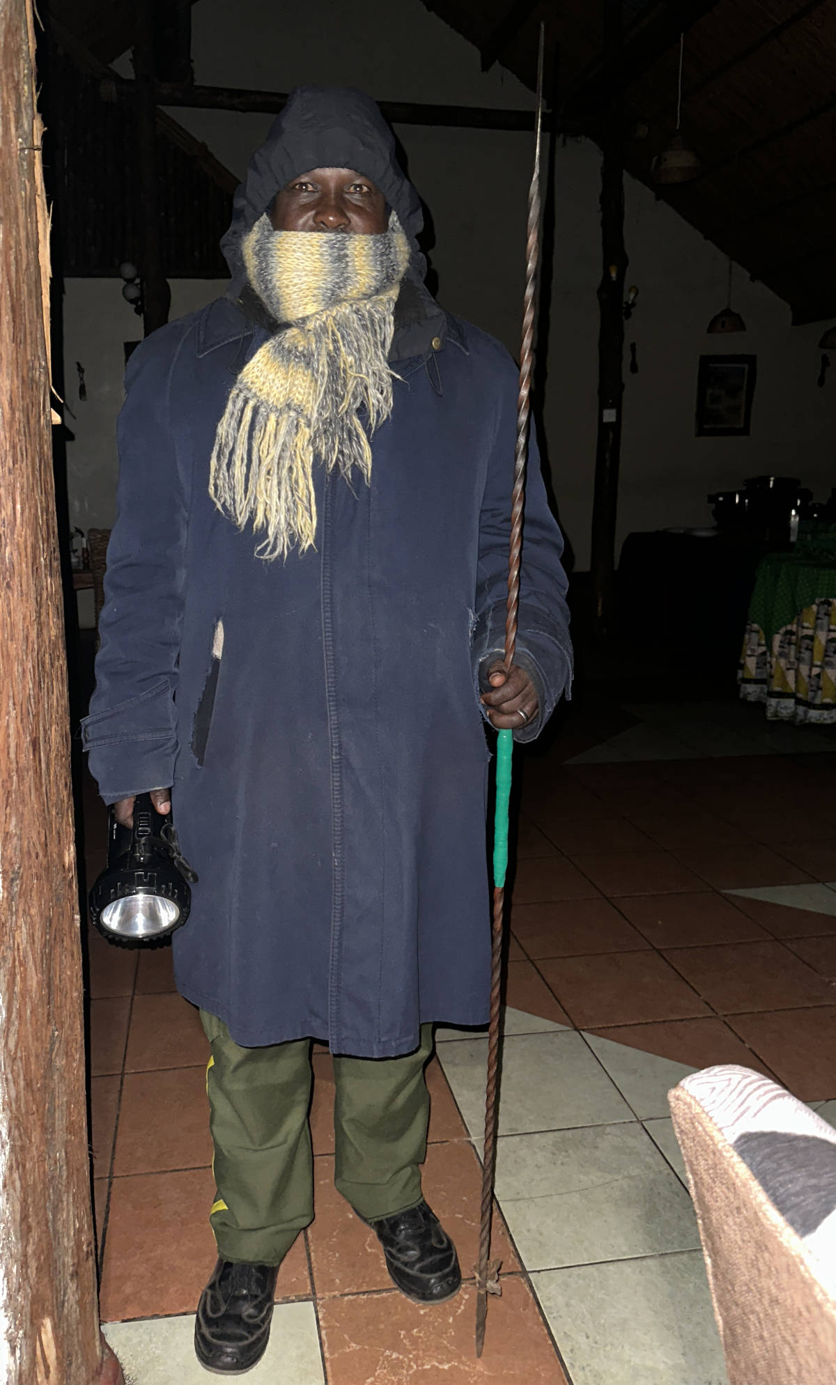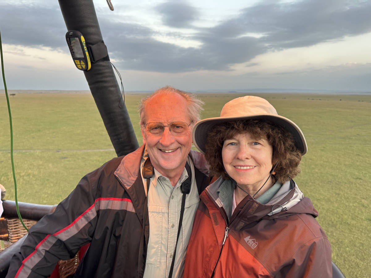 Linda and Emerson are going for a balloon ride over the Masai Mara. Advised not to be outside without an escort after dark, we found our escort ready for us outside our cabin promptly at 4:15am, to accompany us to the main lodge! (BTW-we were given a whistle attached to our room key to use if we had any problems at night).