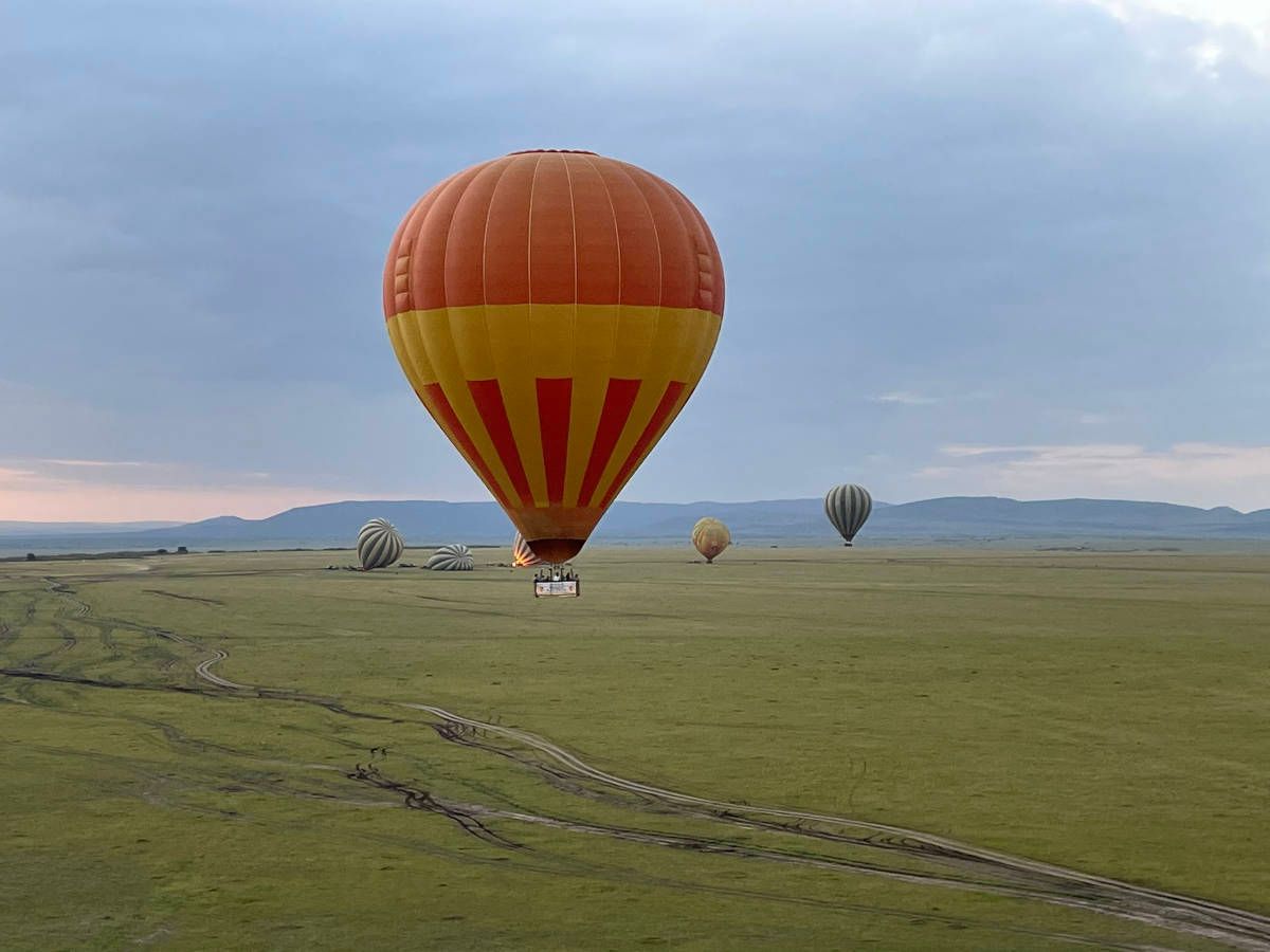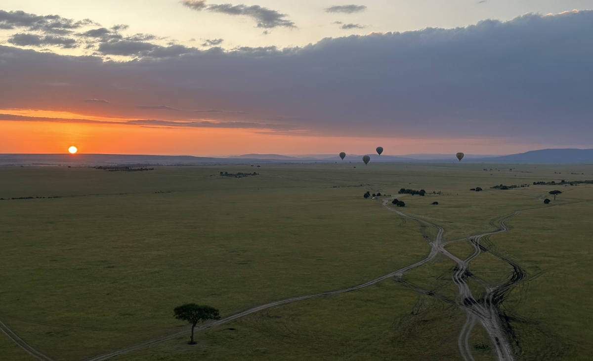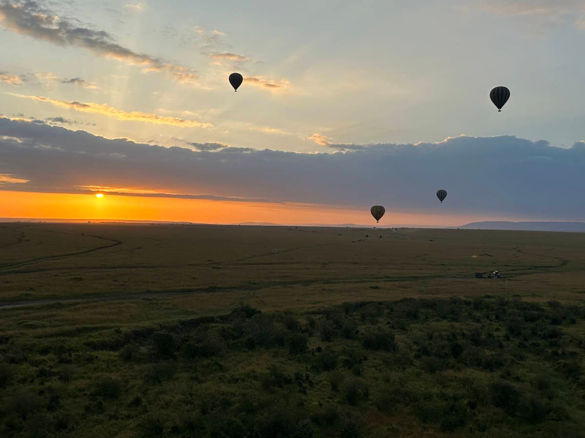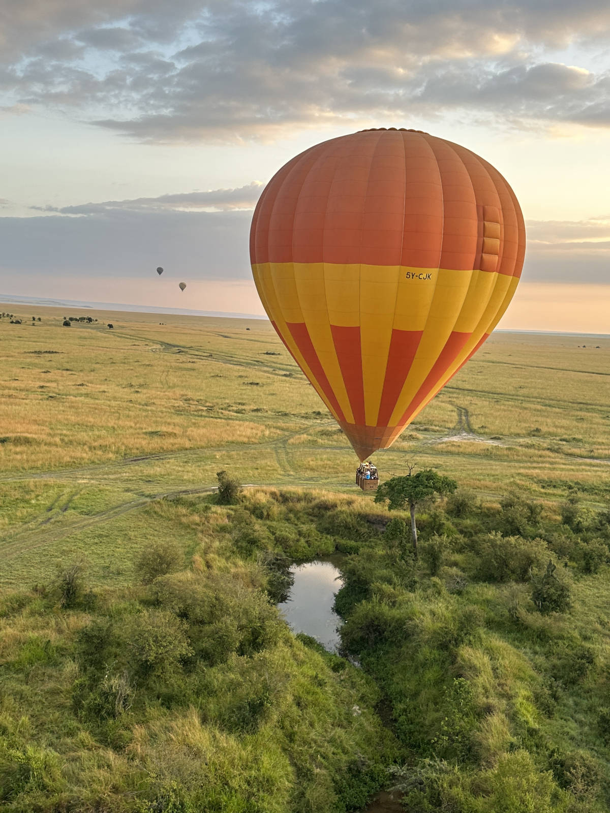 Ballooning over a waterhole with sunrise and sleeping masai warrior mountain range in distance.