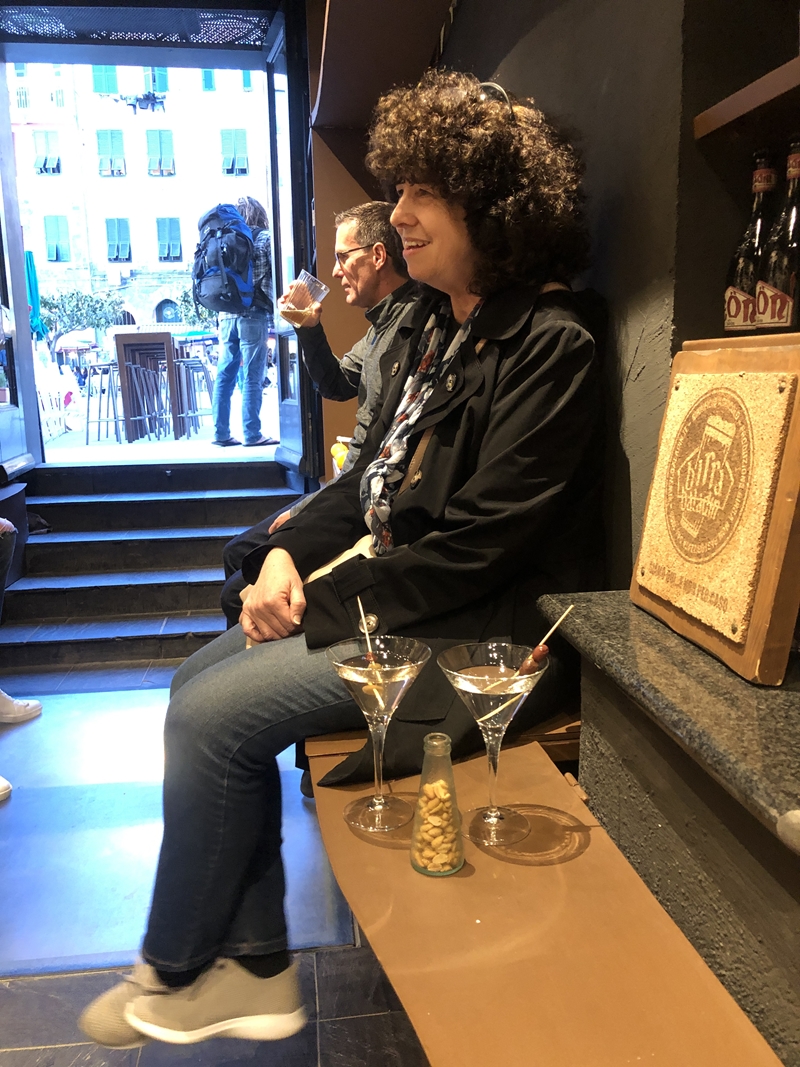 We discover the tineist bar just off the Piazza. It was Wednesday and they made martini's. Linda is talking to another couple that we ran into several more times on the trails.