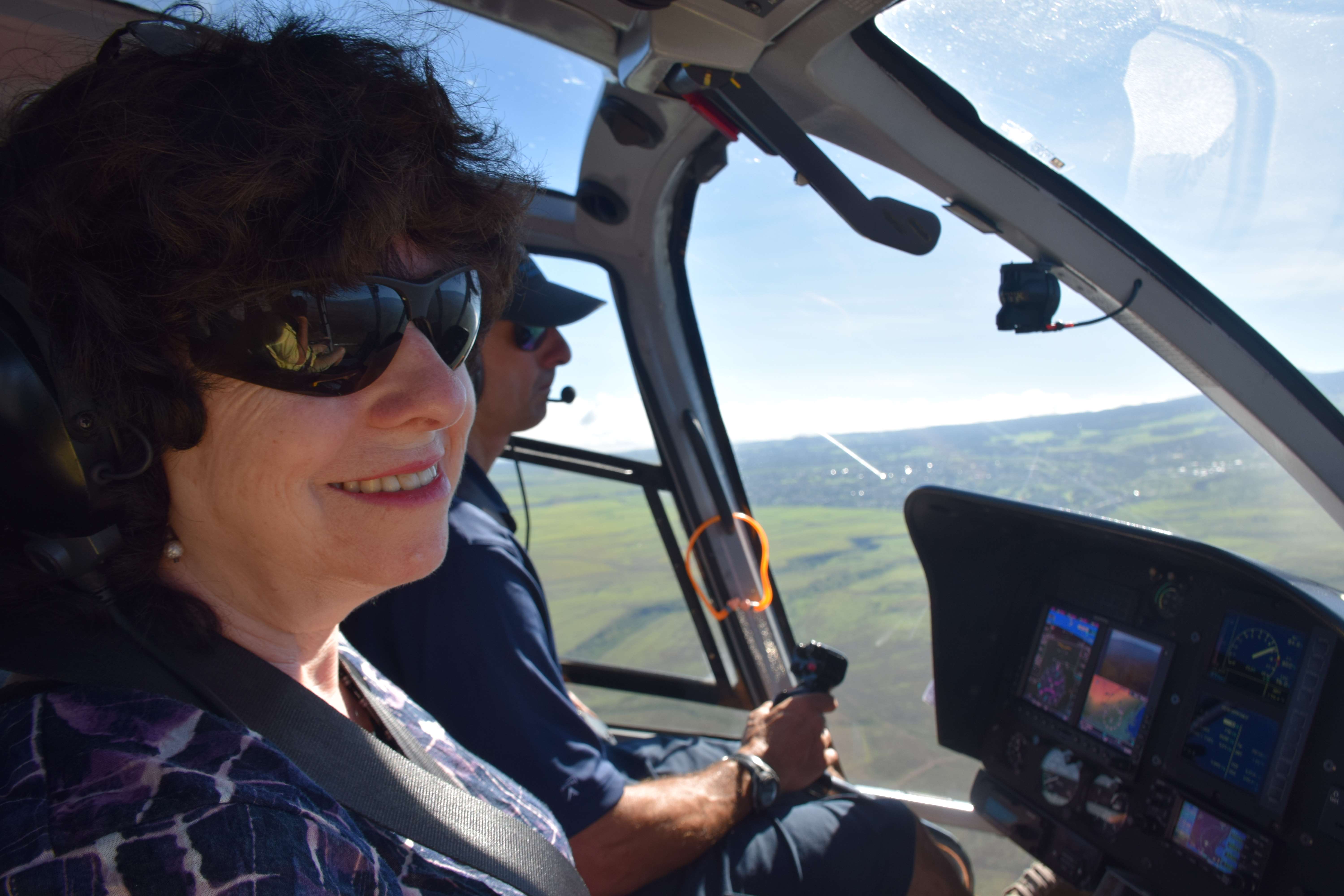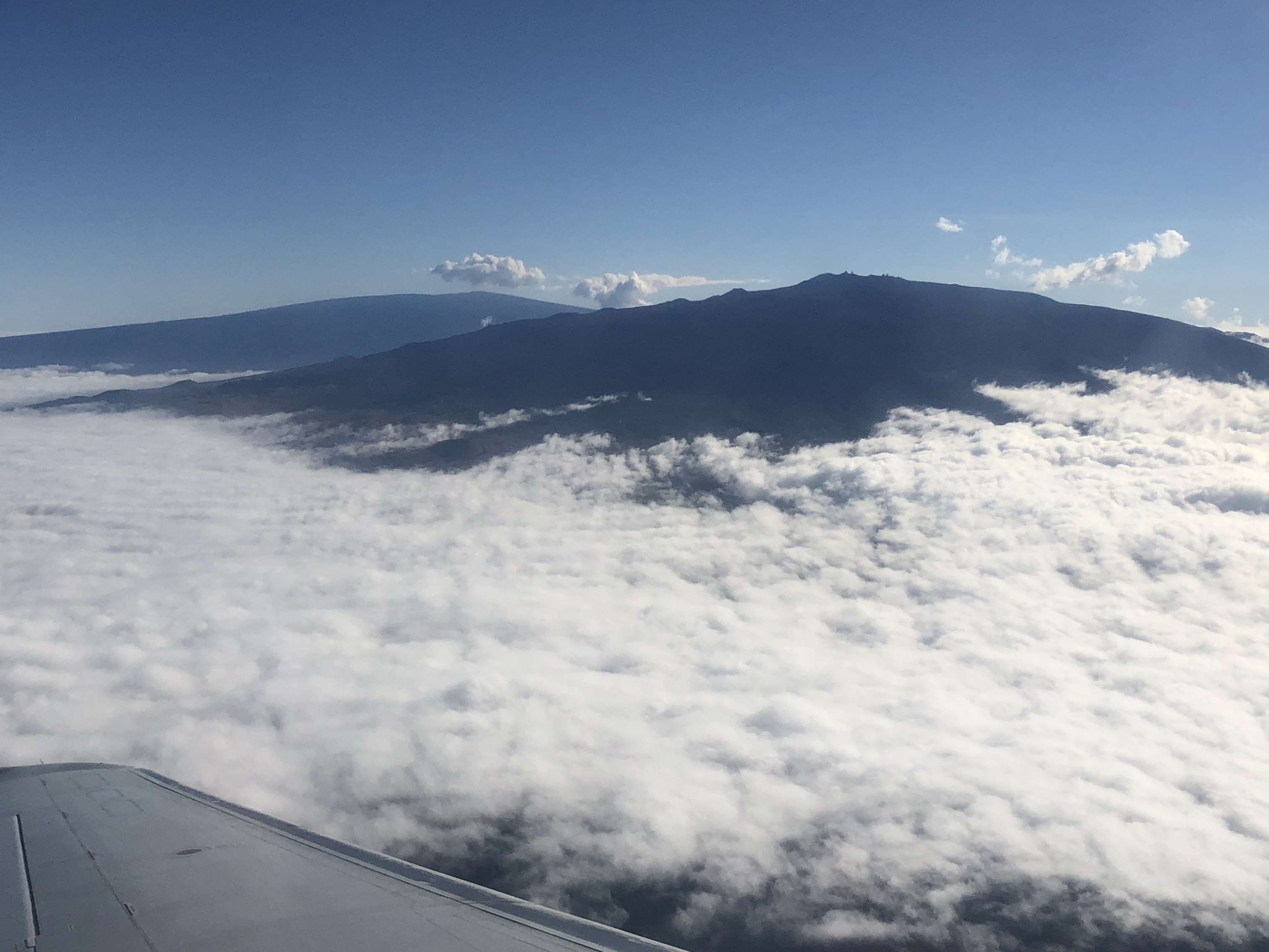 As we fly away we pass by Mauna Kea (13,803 ft) in the foreground with the observatories barely observable and Mauna Loa to the left.