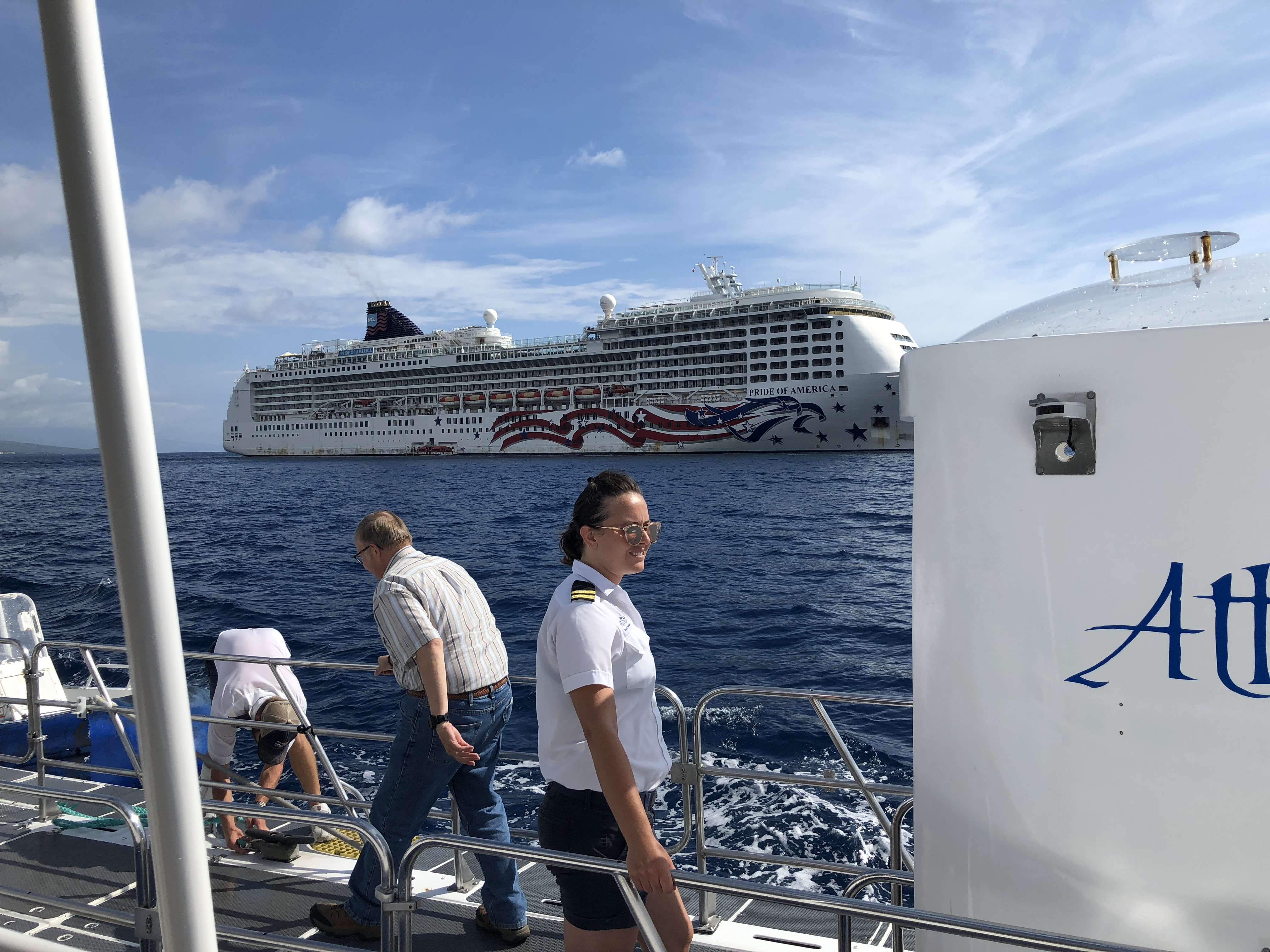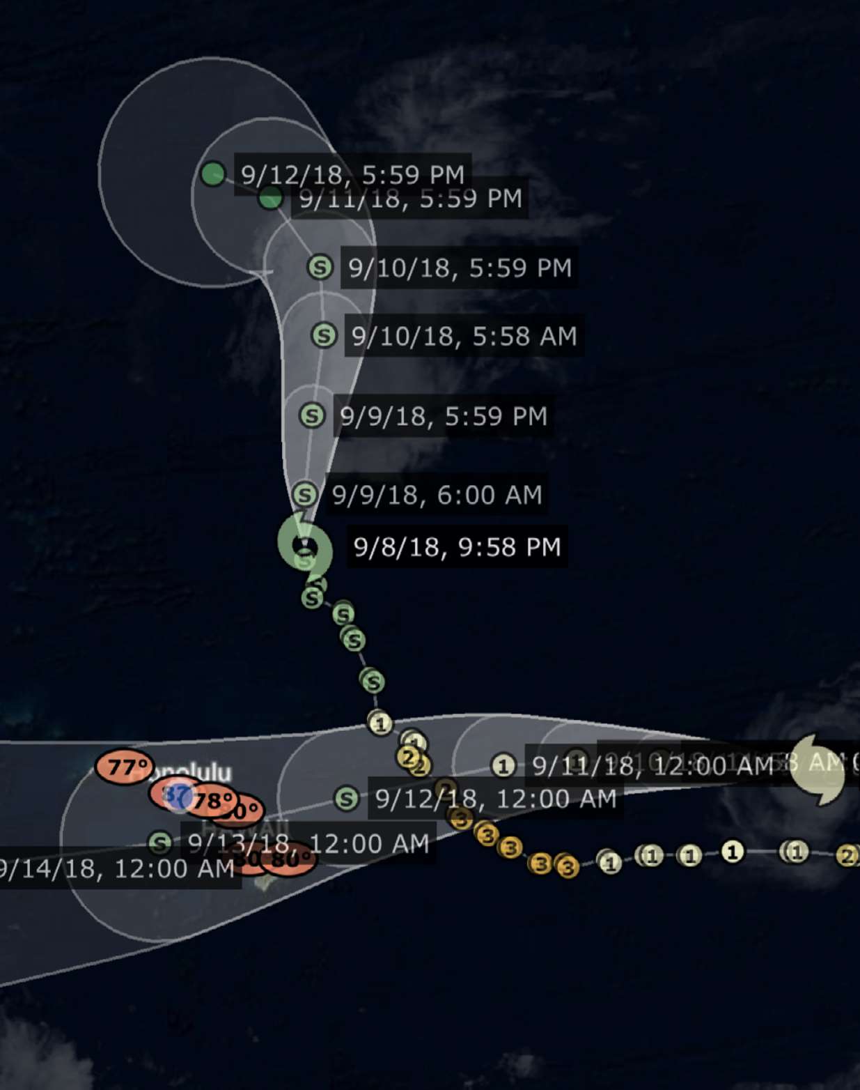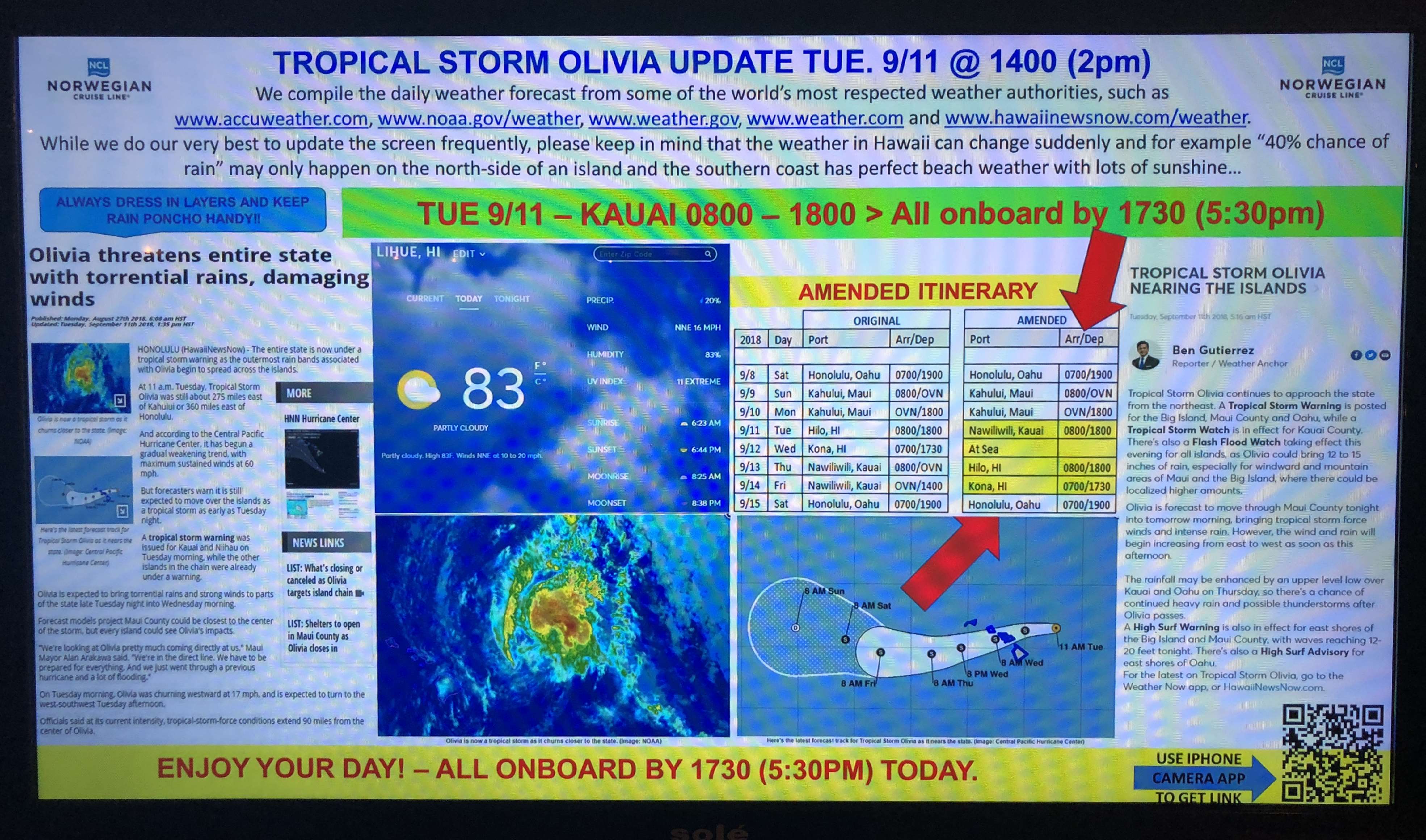 The two hurricanes put a small kink in our trip. Hurricane Norman headed north and Olivia touched on Maui as a tropical storm. We had to leave Kaui early and spent a day at sea before we could dock in Hawaii.