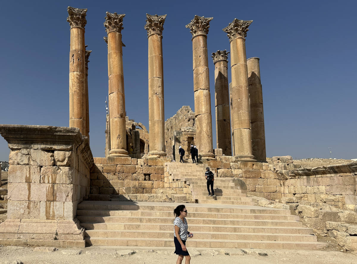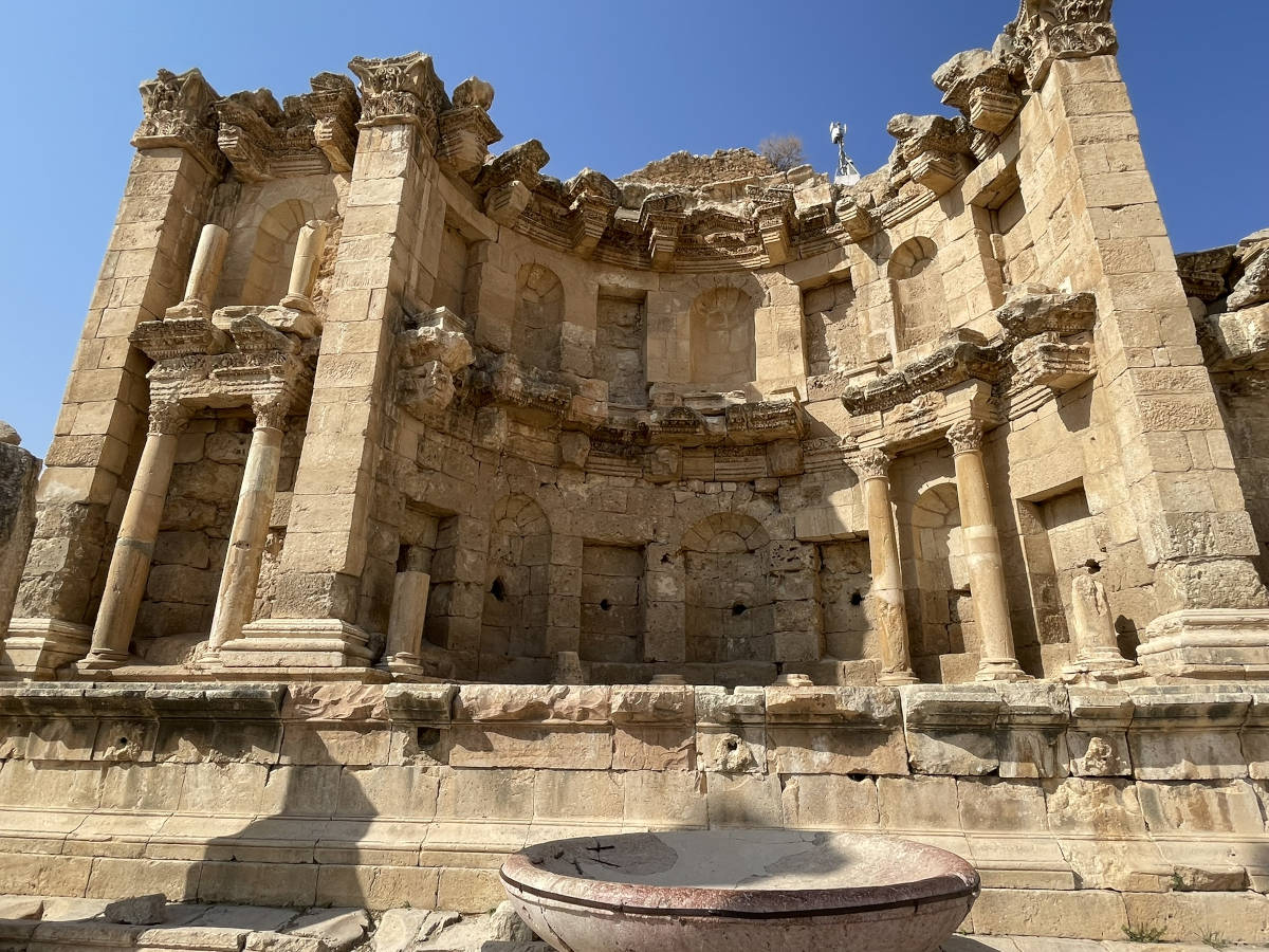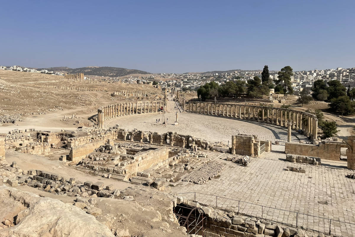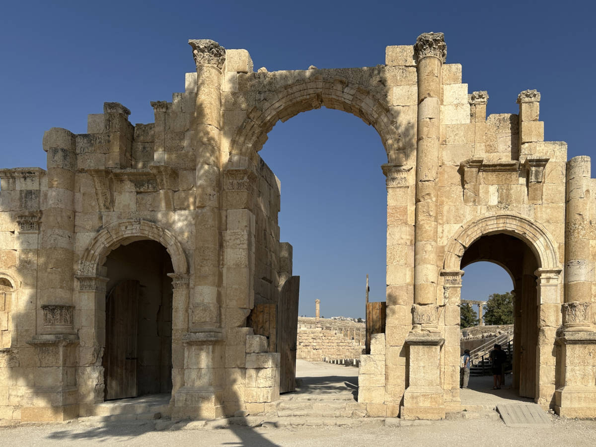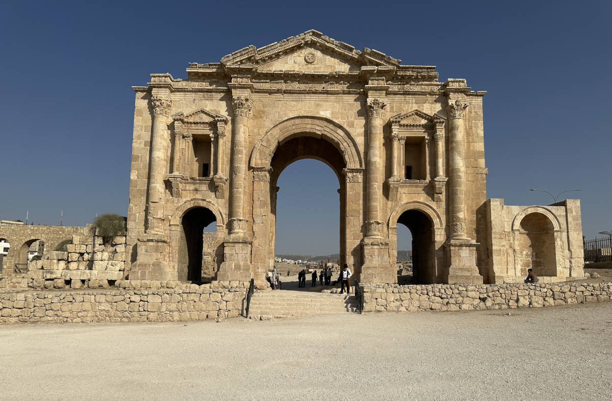 We drive to this treasure north of Amman. The ancient city of Jerash. Here we approach through Hadrian's gate. 10:01