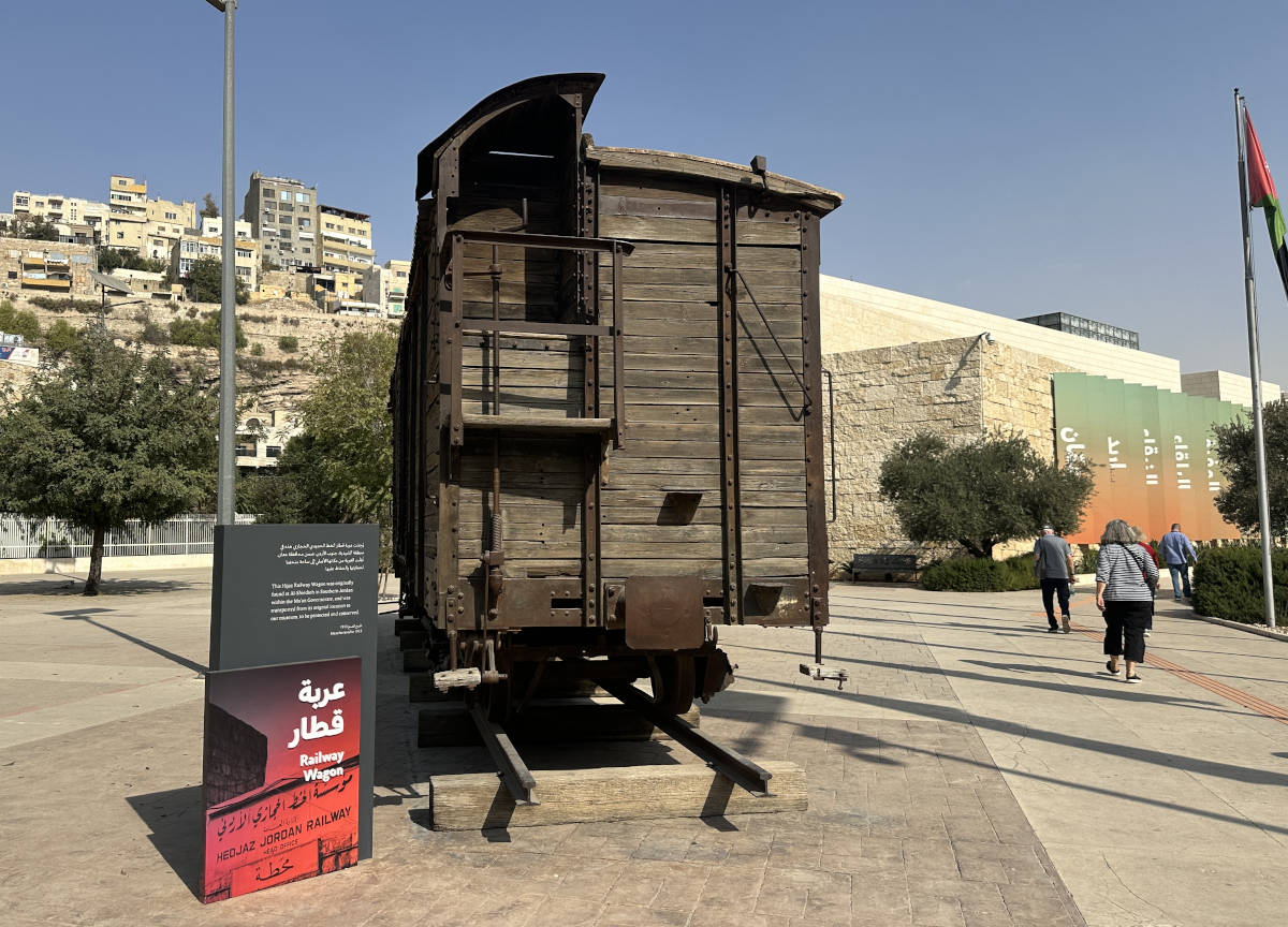 We then go to the Jordan museum. A very modern facility with an old box car from British times out front. 1:28