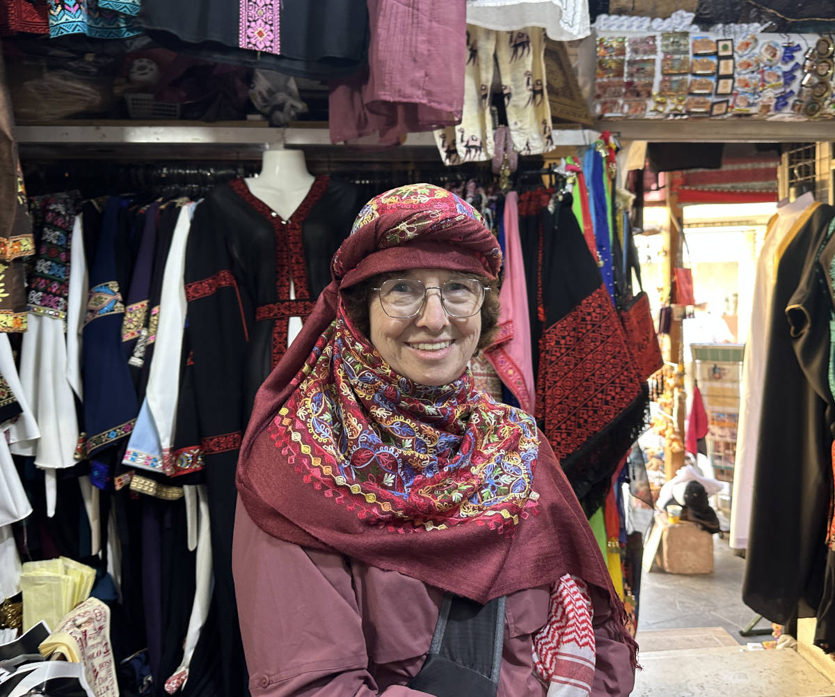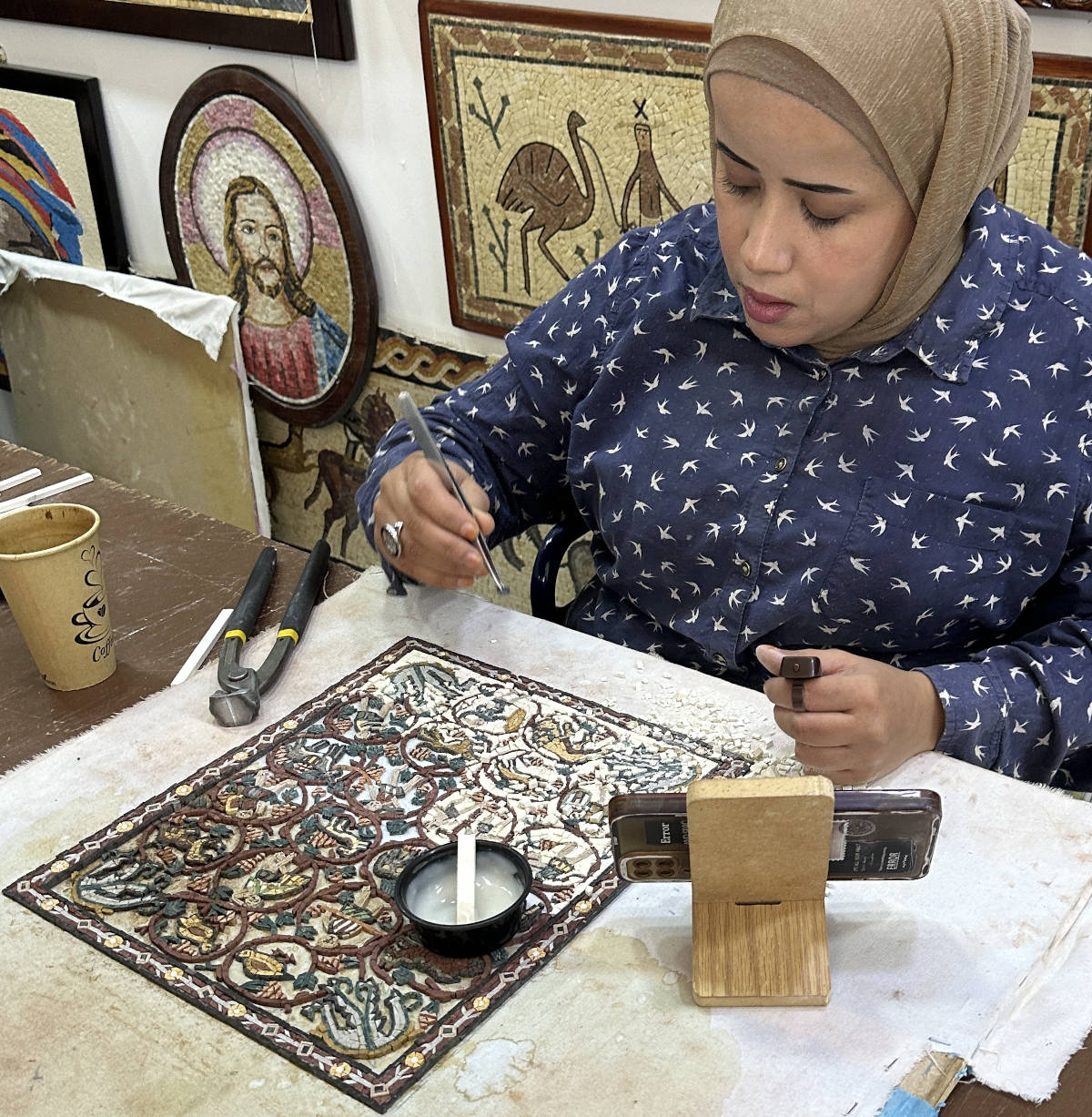 In the nearby town of Madaba. She is building a mosaic.11:01