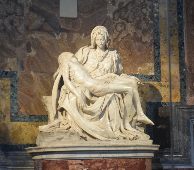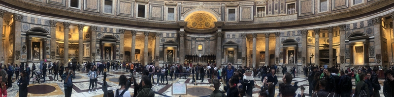 We finally made it inside the Pantheon on our third try, it was well worth the effort. The opening at the top of the building is 29ft in diameter. The dome is 142 ft high the same as the inside diameter. The opening looks much smaller when standing under it. The top opening was used to let out the smoke from candles used for illumination. Twenty two drains are in the floor to get rid of rain water. The Pantheon was completed by Emperor Hadrian circa A.D. 126 after having been started by Marcus Agrippa but his earlier version burned down. It is still the world's largest unreinforced concrete dome. It originally displayed many of the Roman God's. At one point the Pantheon was turned into and is still a Catholic church, the church of St. Mary and the Martyrs.