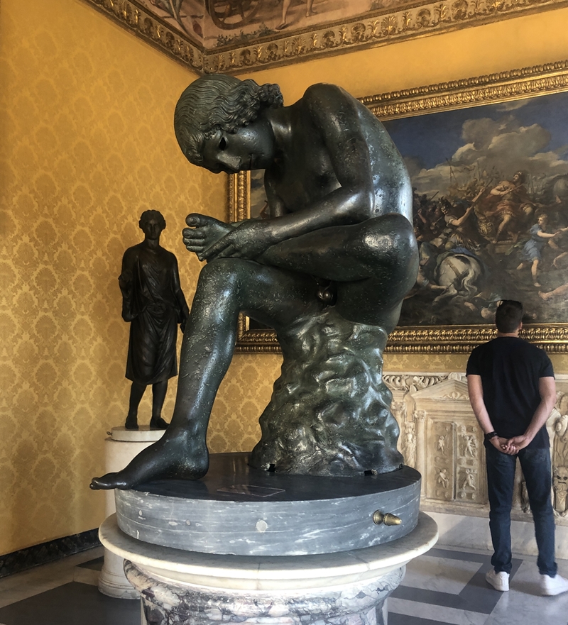 A bronze of a young boy (The Spinario) removing a thorn from his foot. 1st century BC.