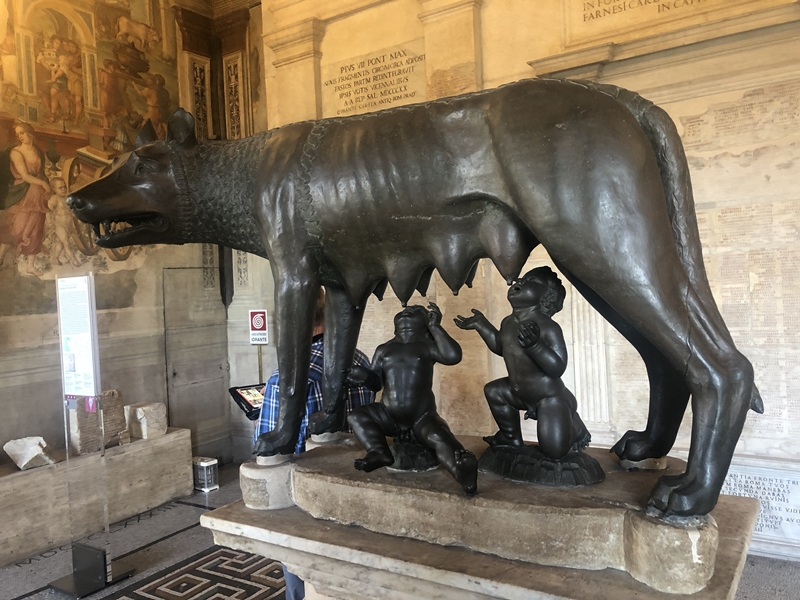 The Capitoline She-wolf. A bronze most likely from the 5th century BC but might be much newer. The She-wolf was taken up as the symbol of Rome after it was moved to Capitol Hill around 1471. The two boys were added later. The she-wolf appears all over Rome.