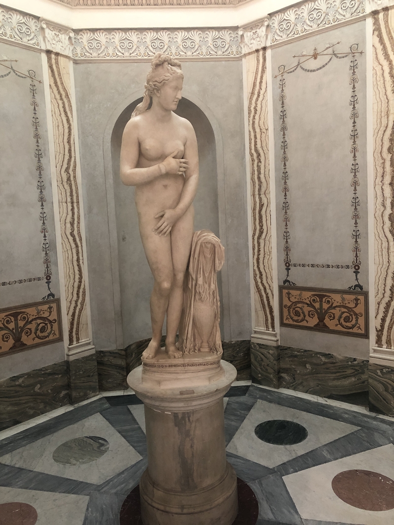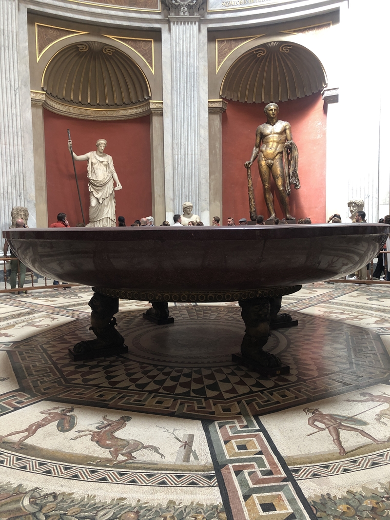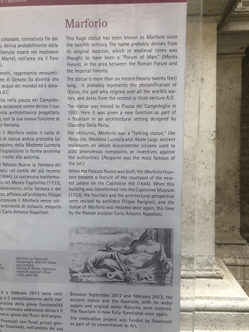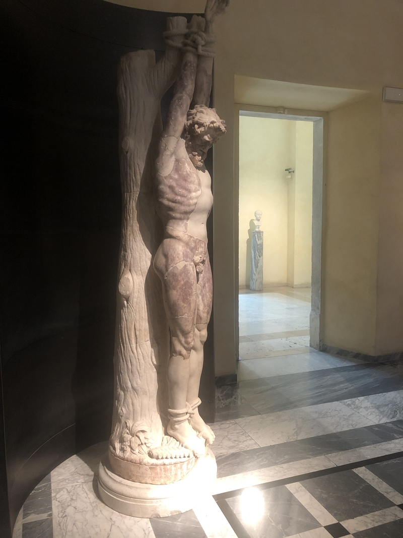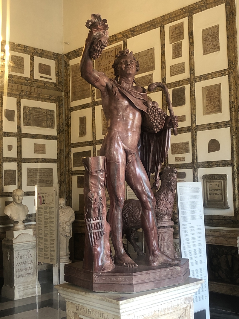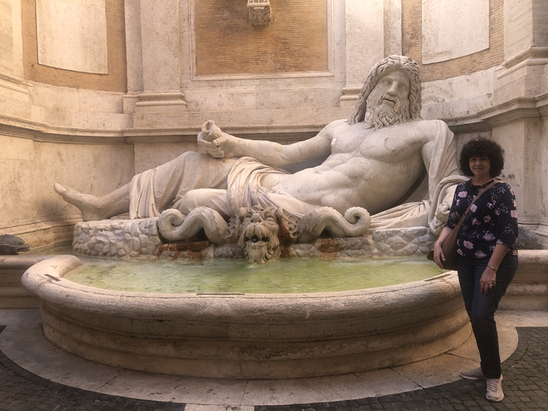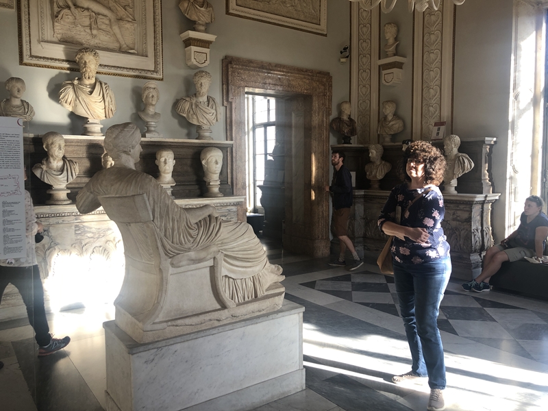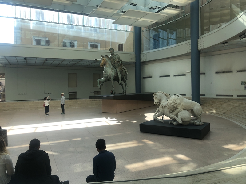 We go inside the Capitoline Museum. Pope Clement XII opened it to the public in 1734 making it the first museum open to the public. Its collections started in 1471 under Pope Sixtus IV. Michelangelo worked on the design of the Capitoline Hill circa 1568. It is one of the seven hills of Rome. They have a nice coffee shop with a patio with nice views where you can rest up a bit. We enjoyed coffee and a snack before viewing the exhibits.